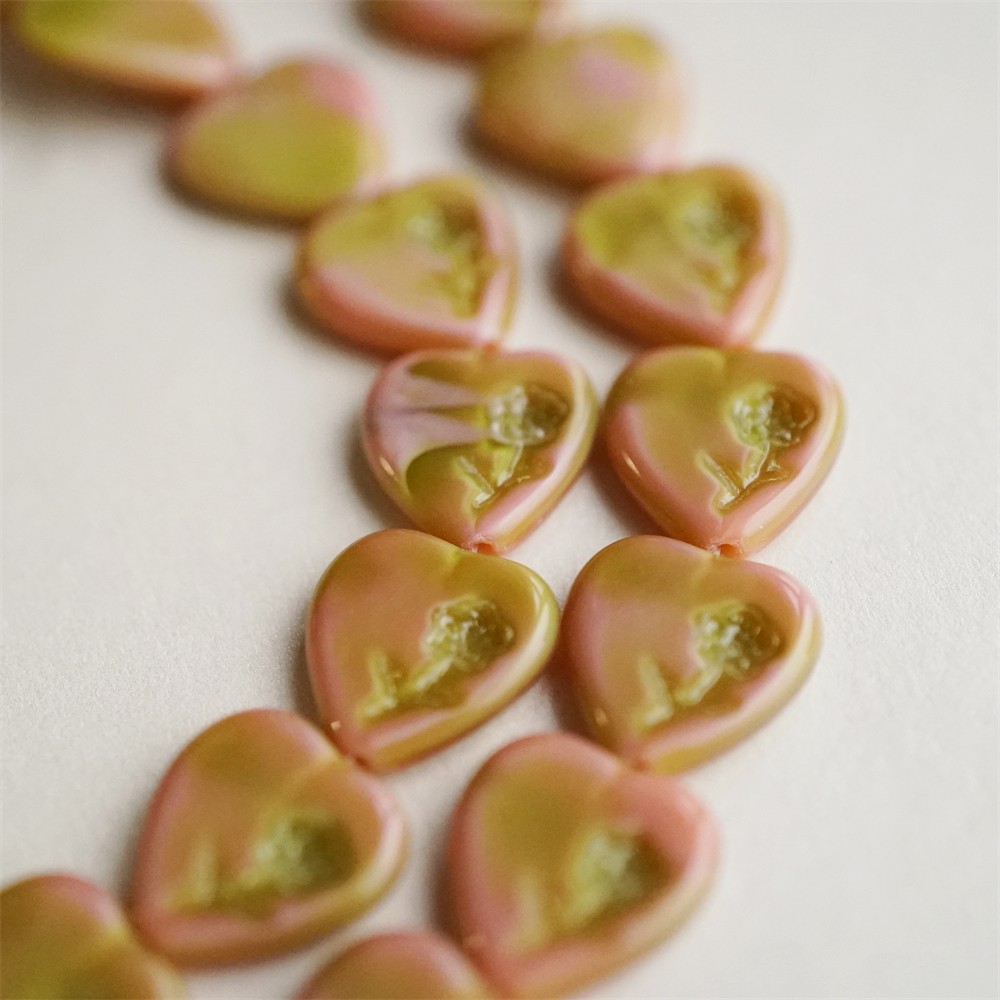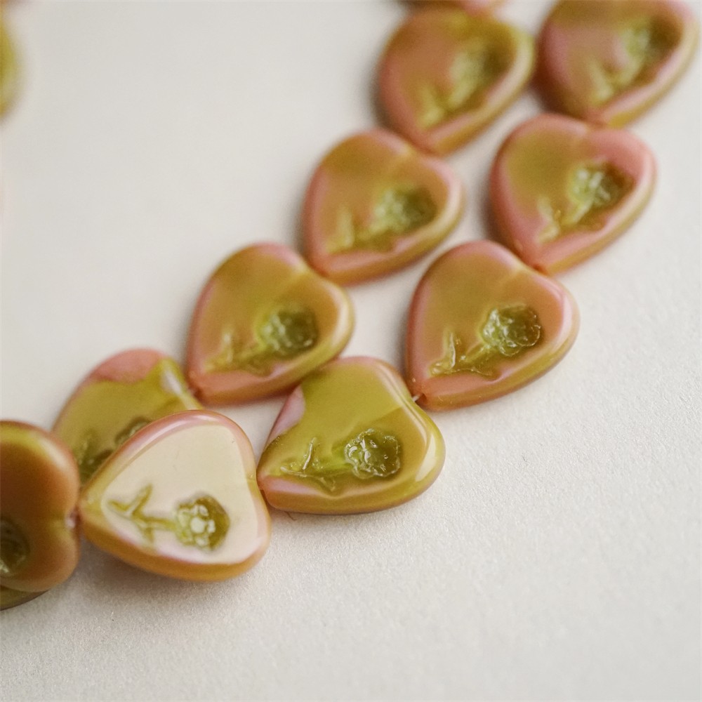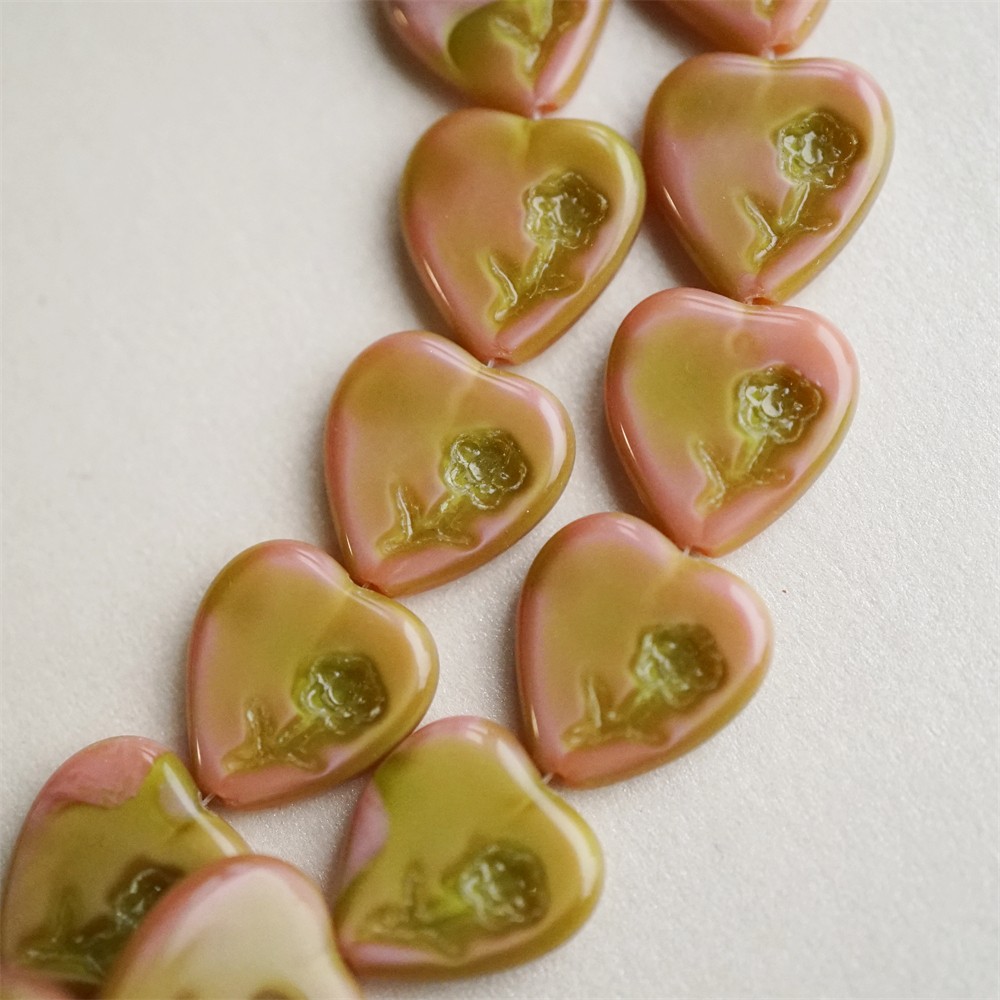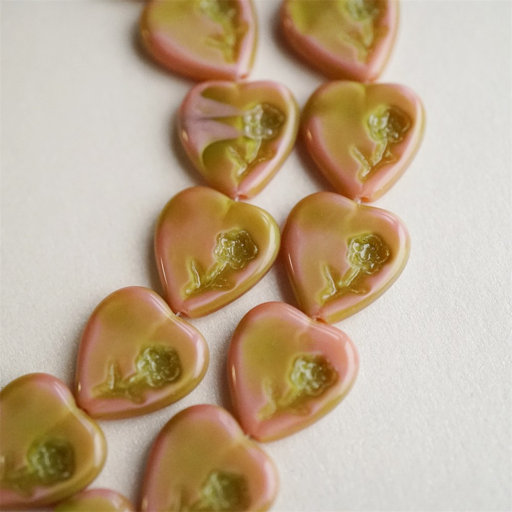 玫瑰粉绿花园mix渐变~小花爱心捷克珠玻璃琉璃珠 15MM