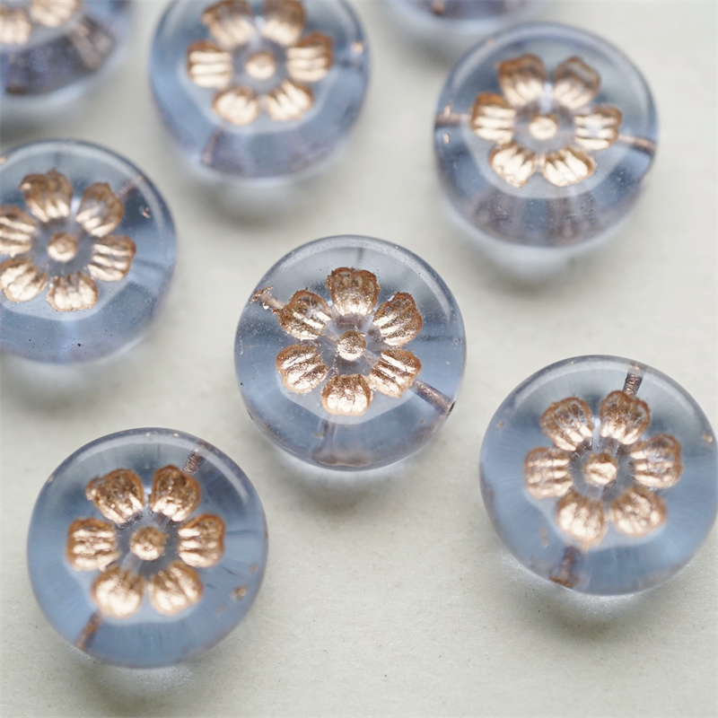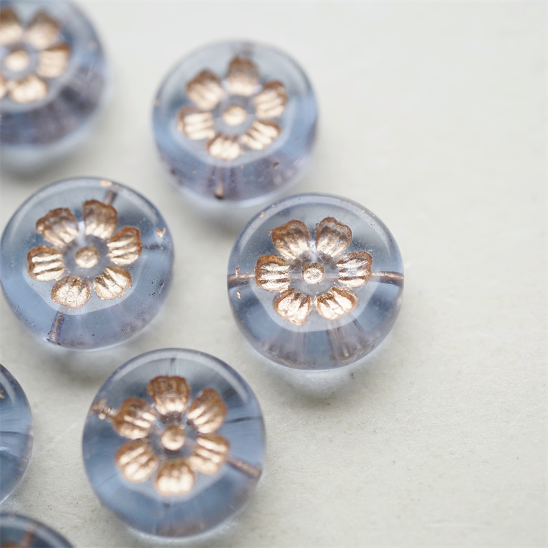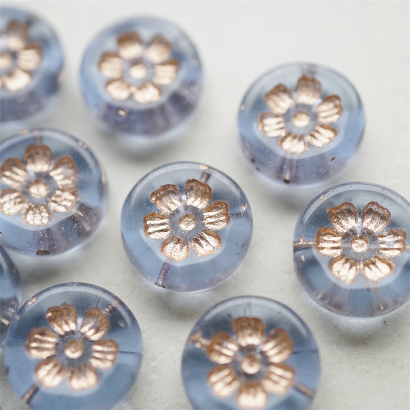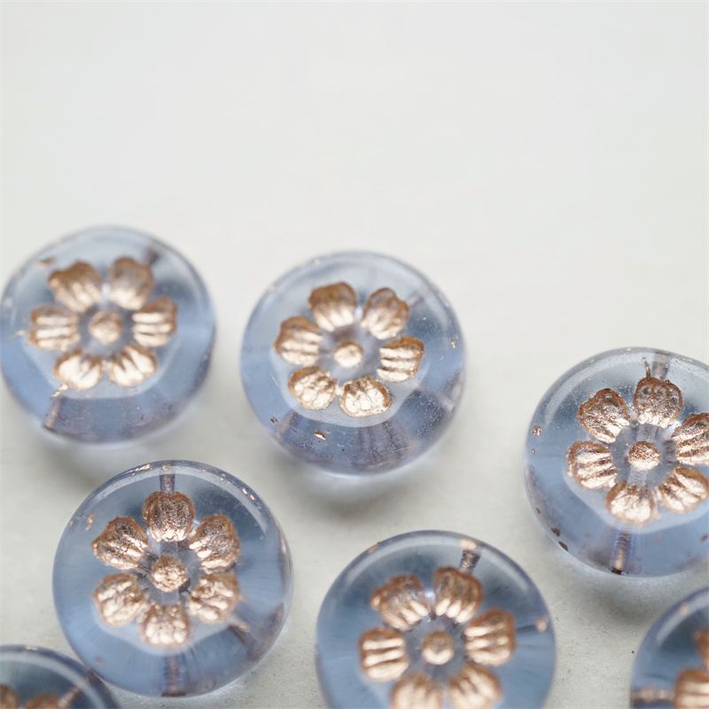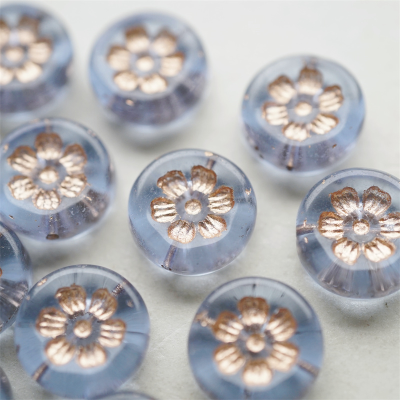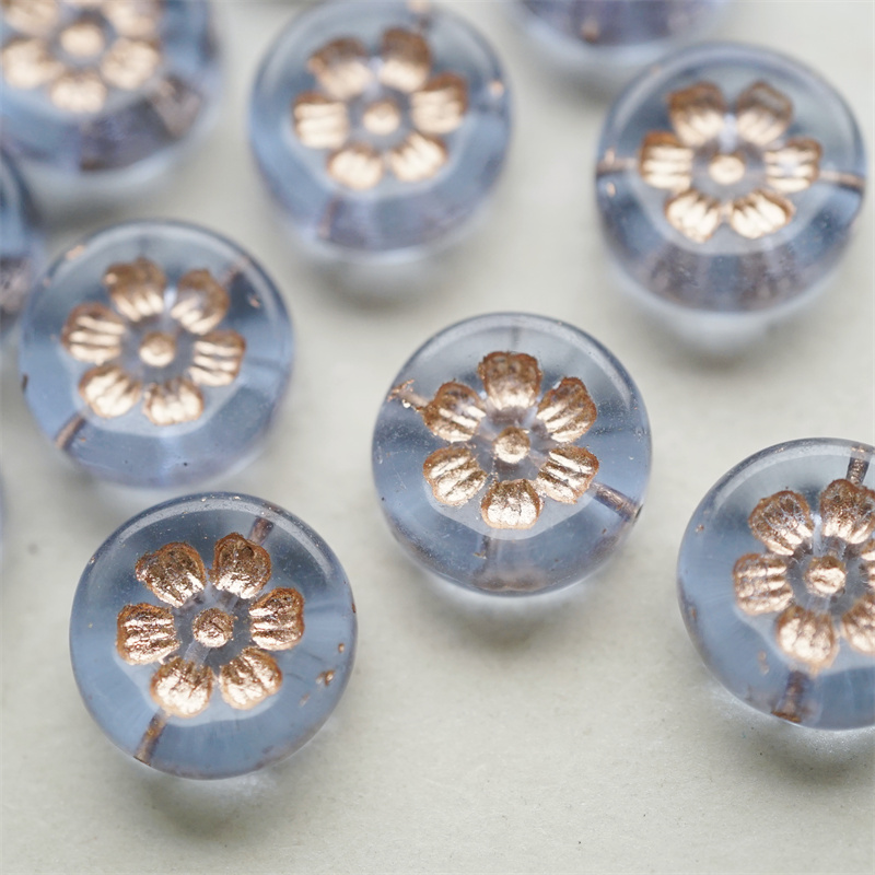 透雾霾蓝描玫瑰金色~刻印花朵少女复古扁圆捷克珠玻璃琉璃珠 16MM