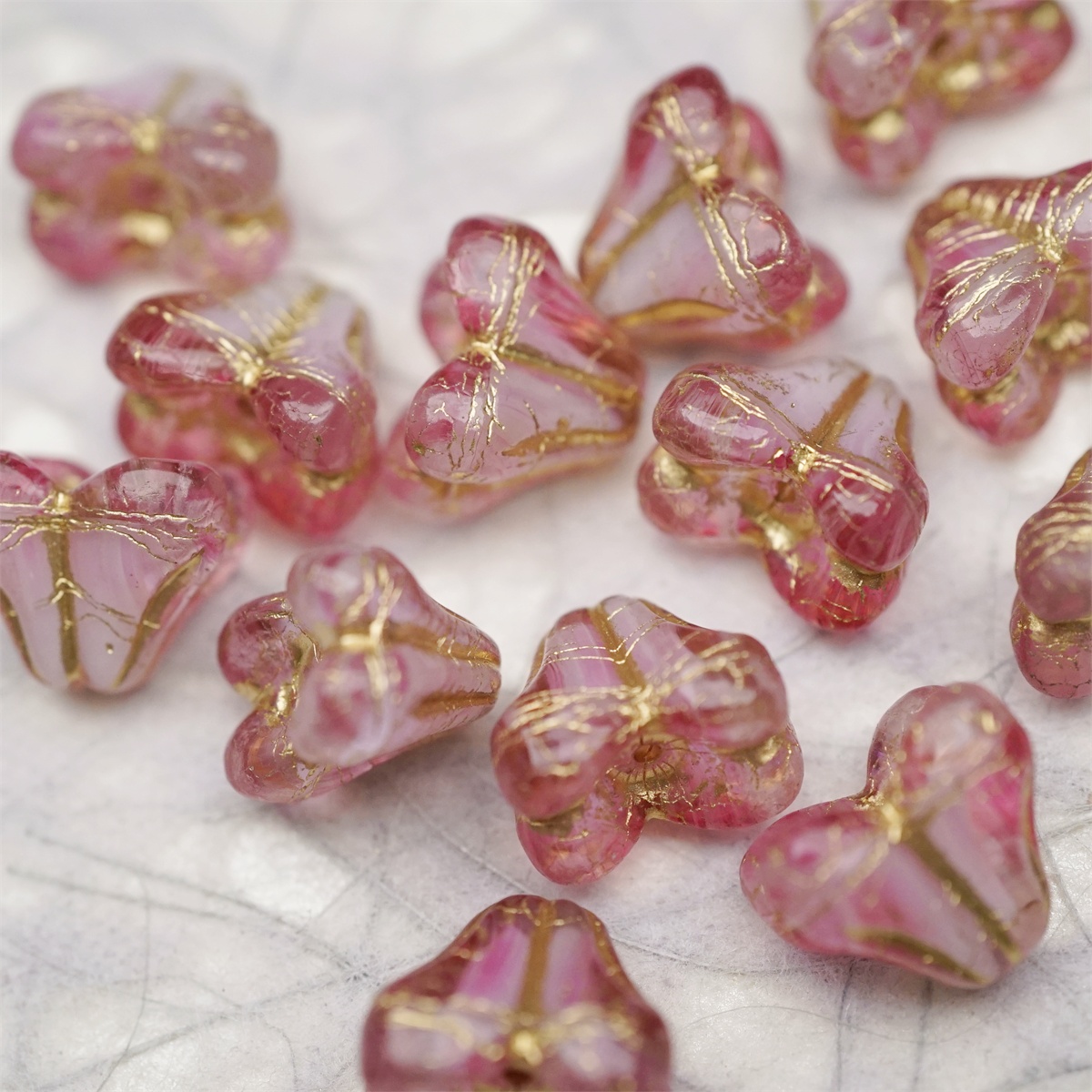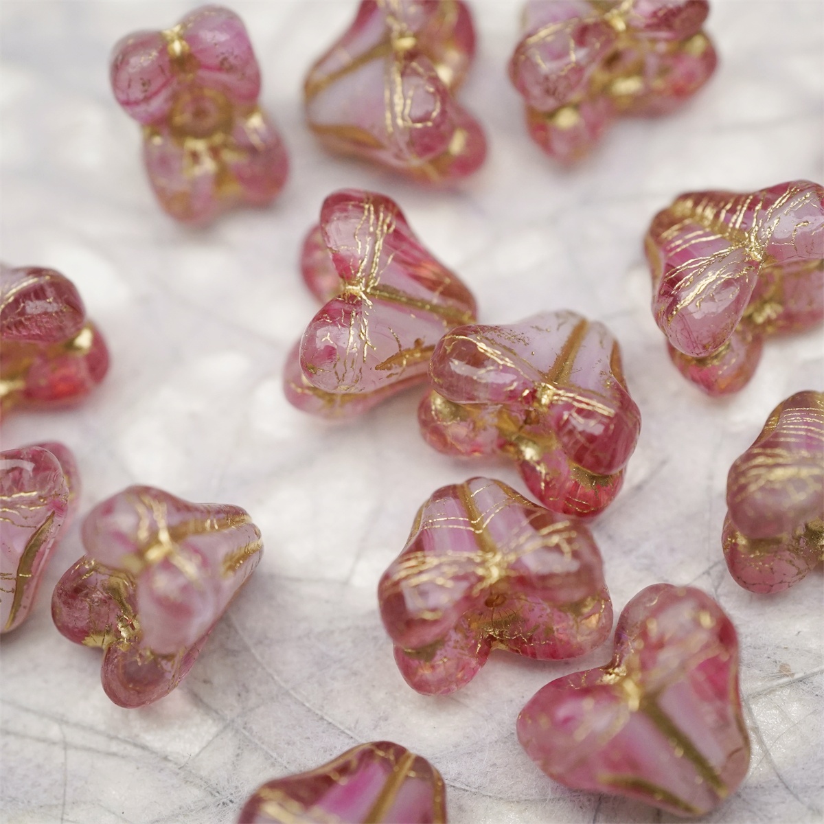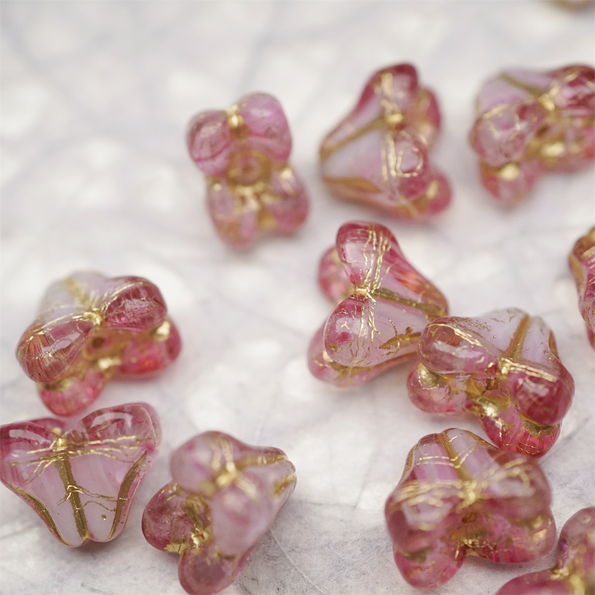 亮面粉白夹心mix描金色~铃兰扁形古董珠形四叶花托捷克珠玻璃珠琉璃珠 9X13MM
