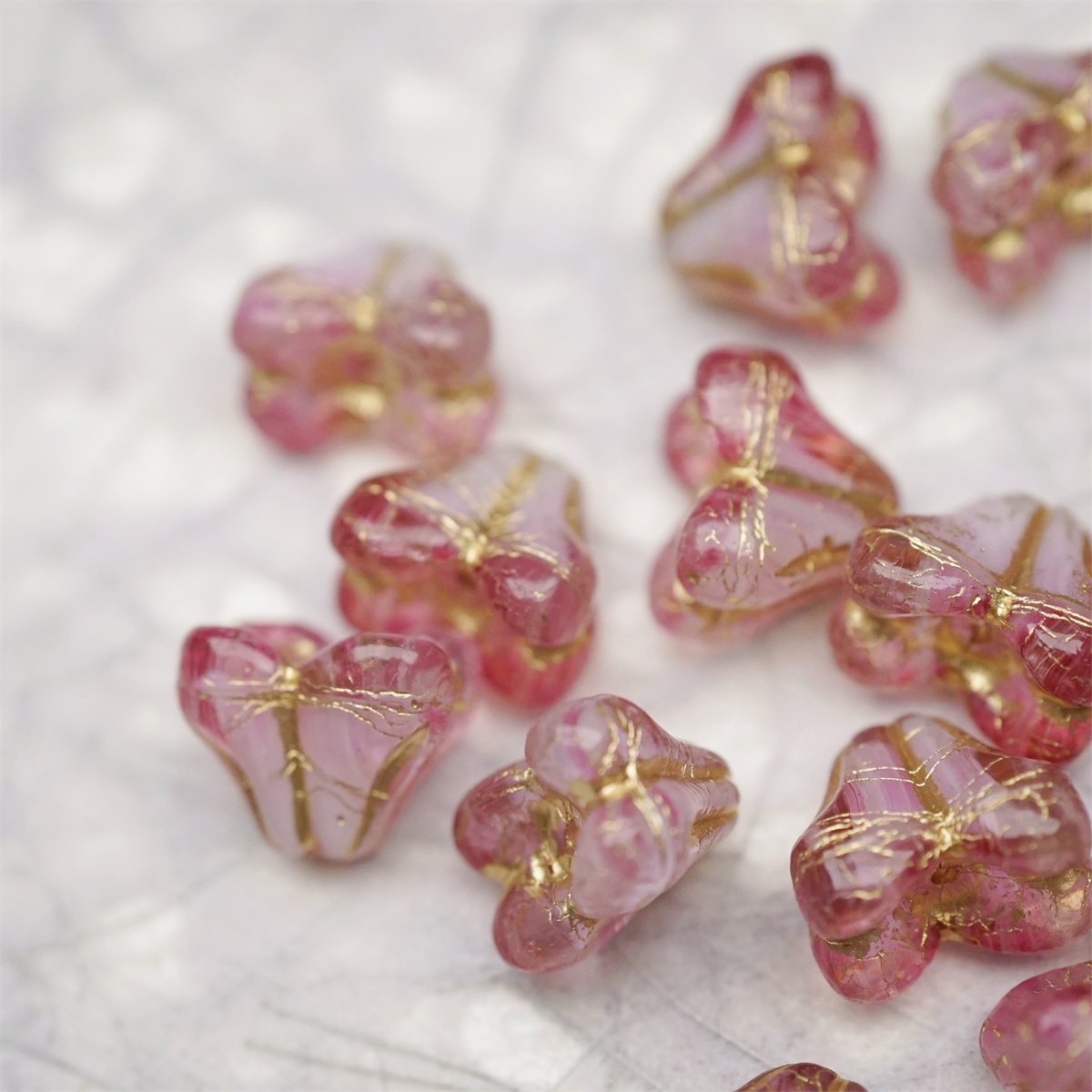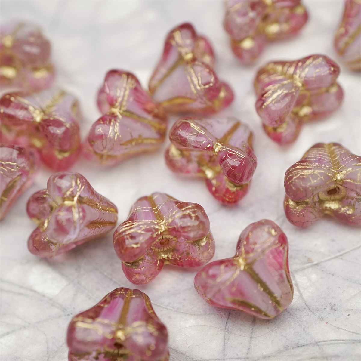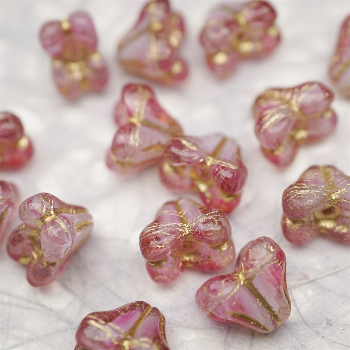 亮面粉白夹心mix描金色~铃兰扁形古董珠形四叶花托捷克珠玻璃珠琉璃珠 9X13MM