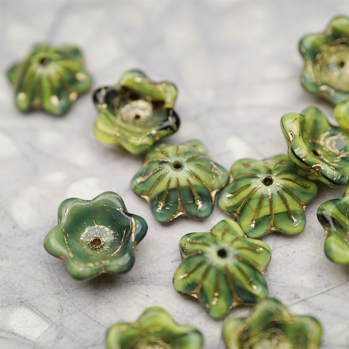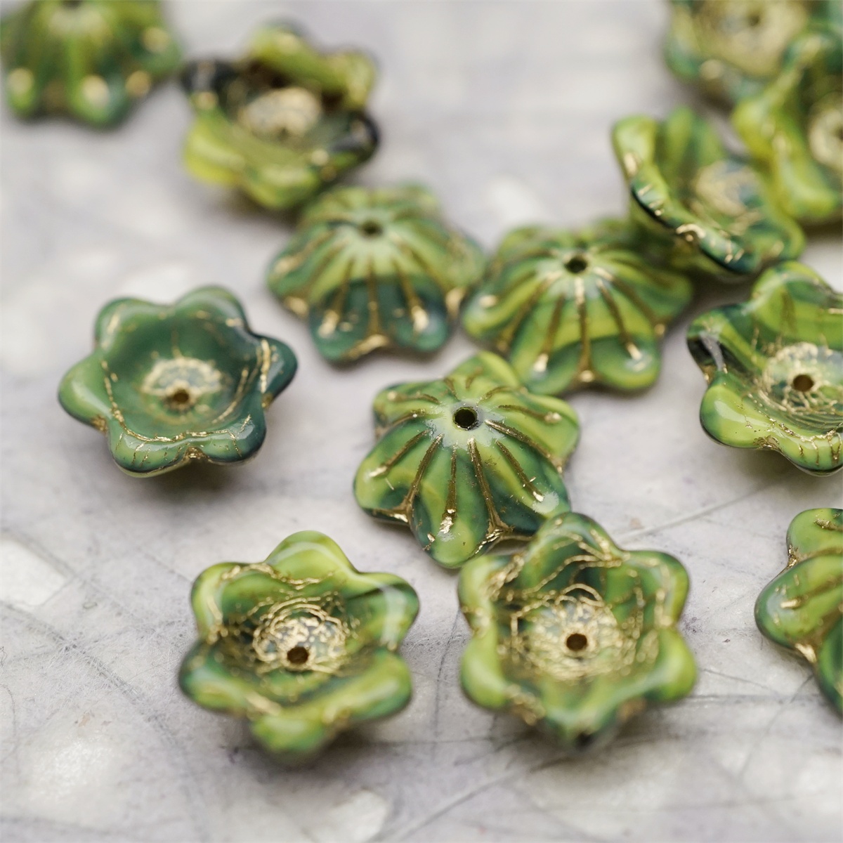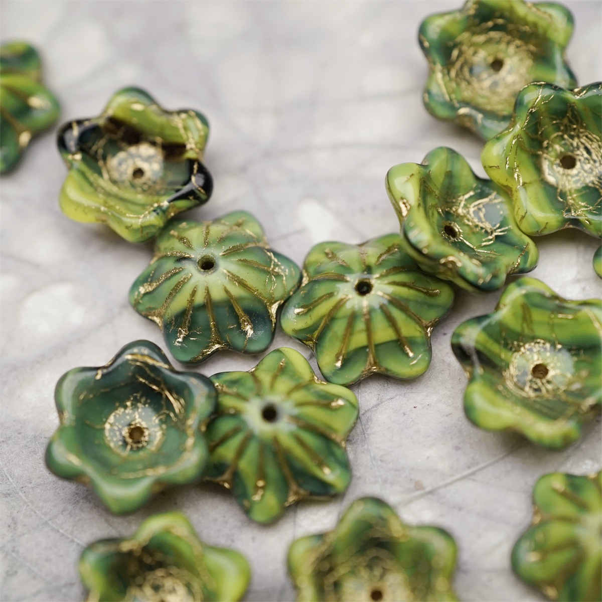 亮面荆棘丛林绿渐变mix描金色~小碗花贝尔铃铛花铃兰捷克珠玻璃琉璃珠 14MM