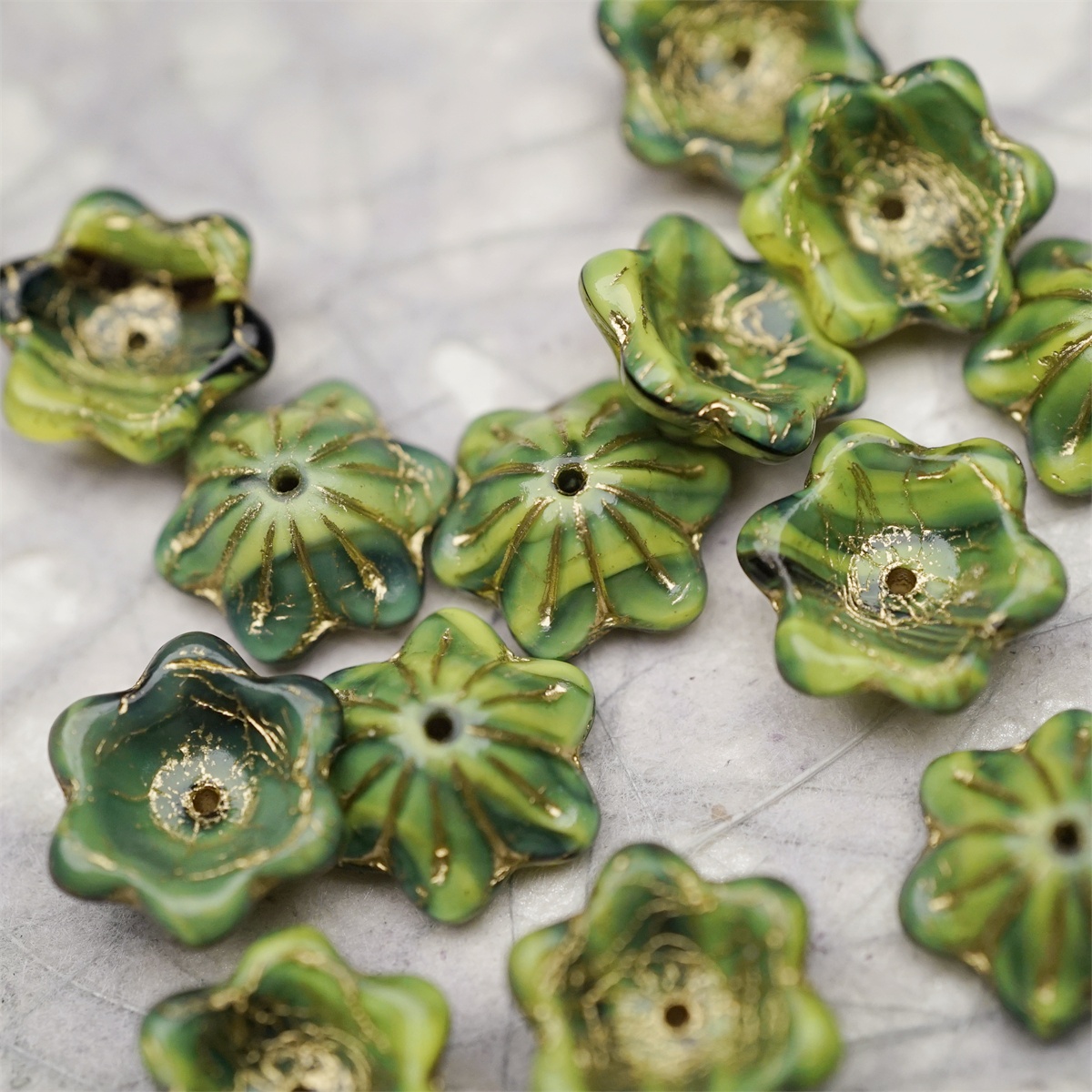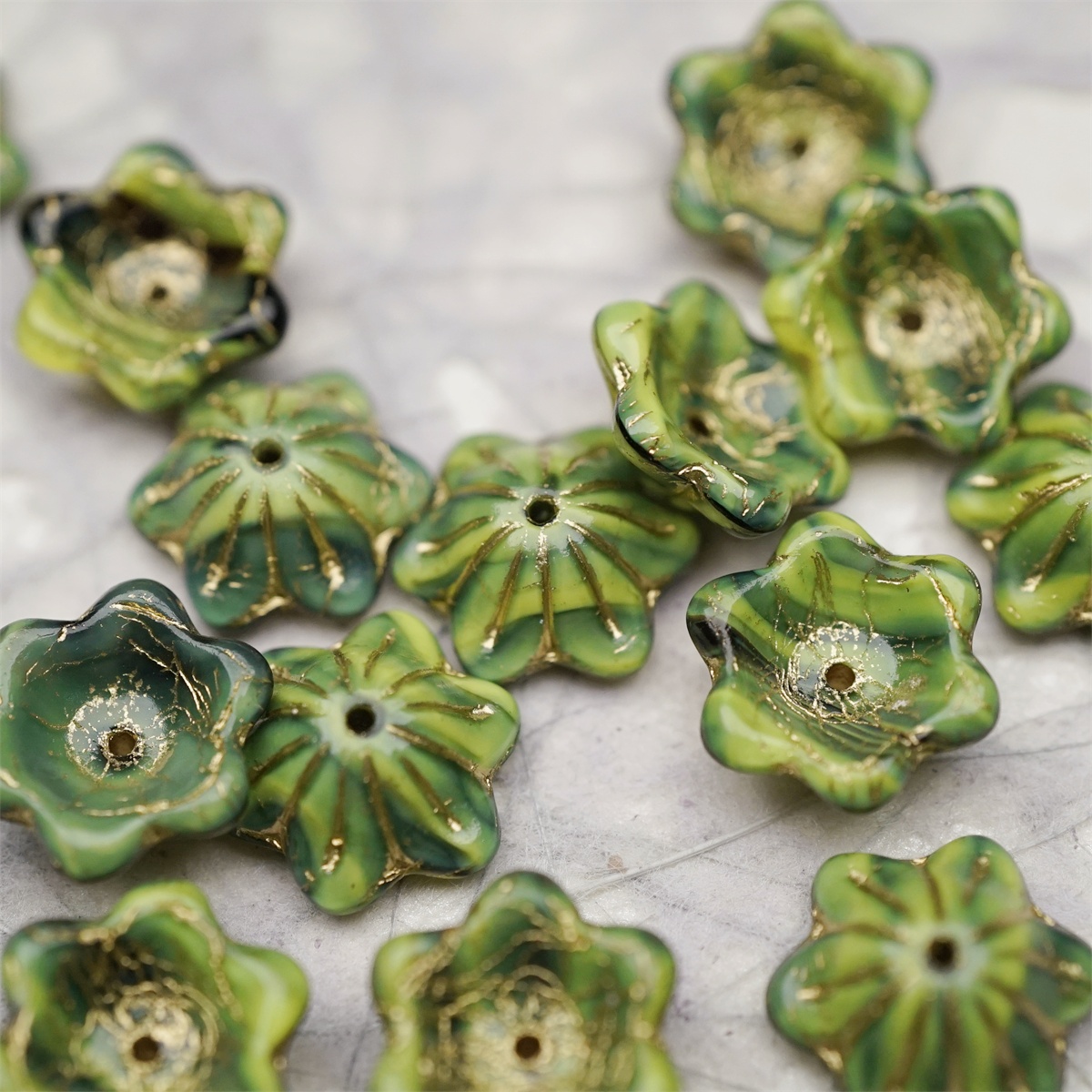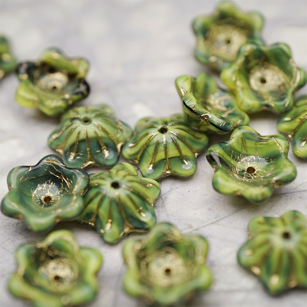 亮面荆棘丛林绿渐变mix描金色~小碗花贝尔铃铛花铃兰捷克珠玻璃琉璃珠 14MM