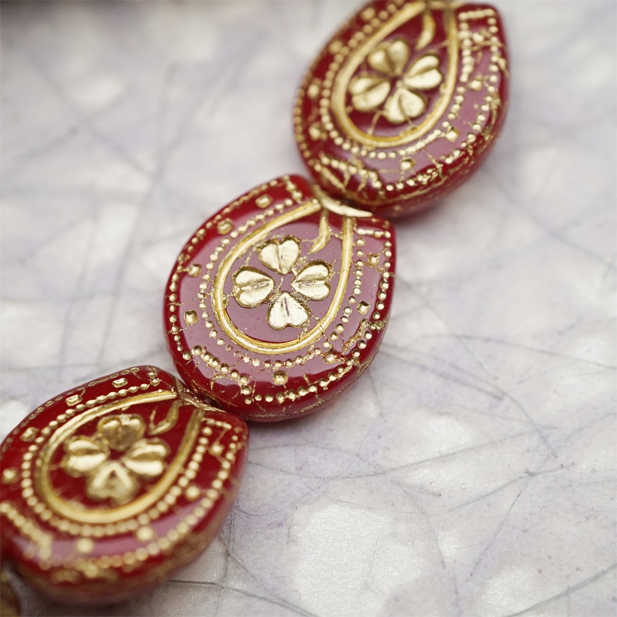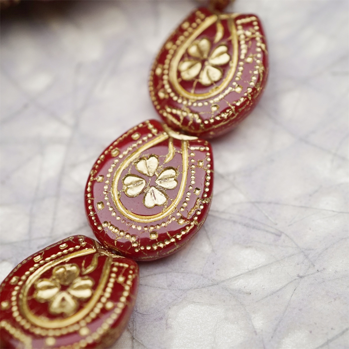 复古深红描金色~趣味马蹄铁形四叶草花纹捷克珠玻璃琉璃珠 21X18MM