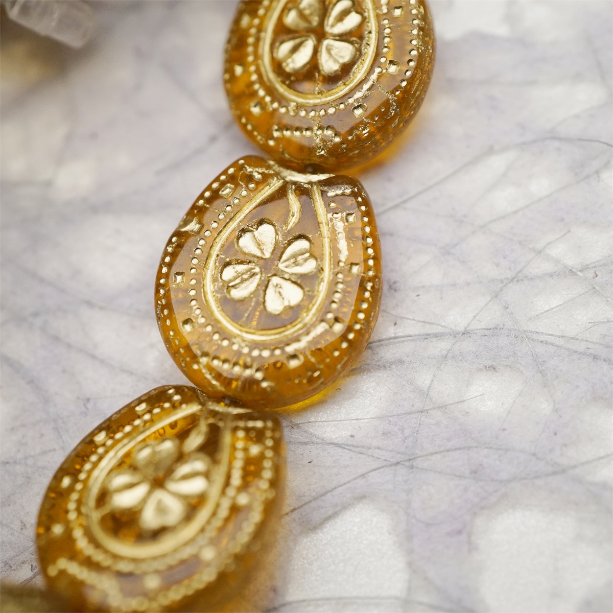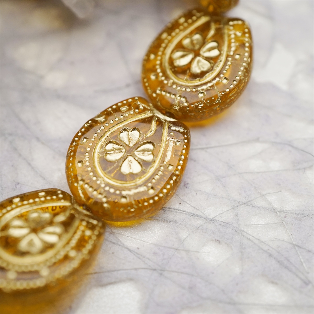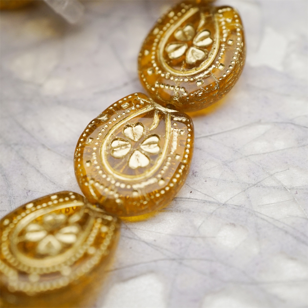 透琥珀色描金色~趣味马蹄铁形四叶草花纹捷克珠玻璃琉璃珠 21X18MM