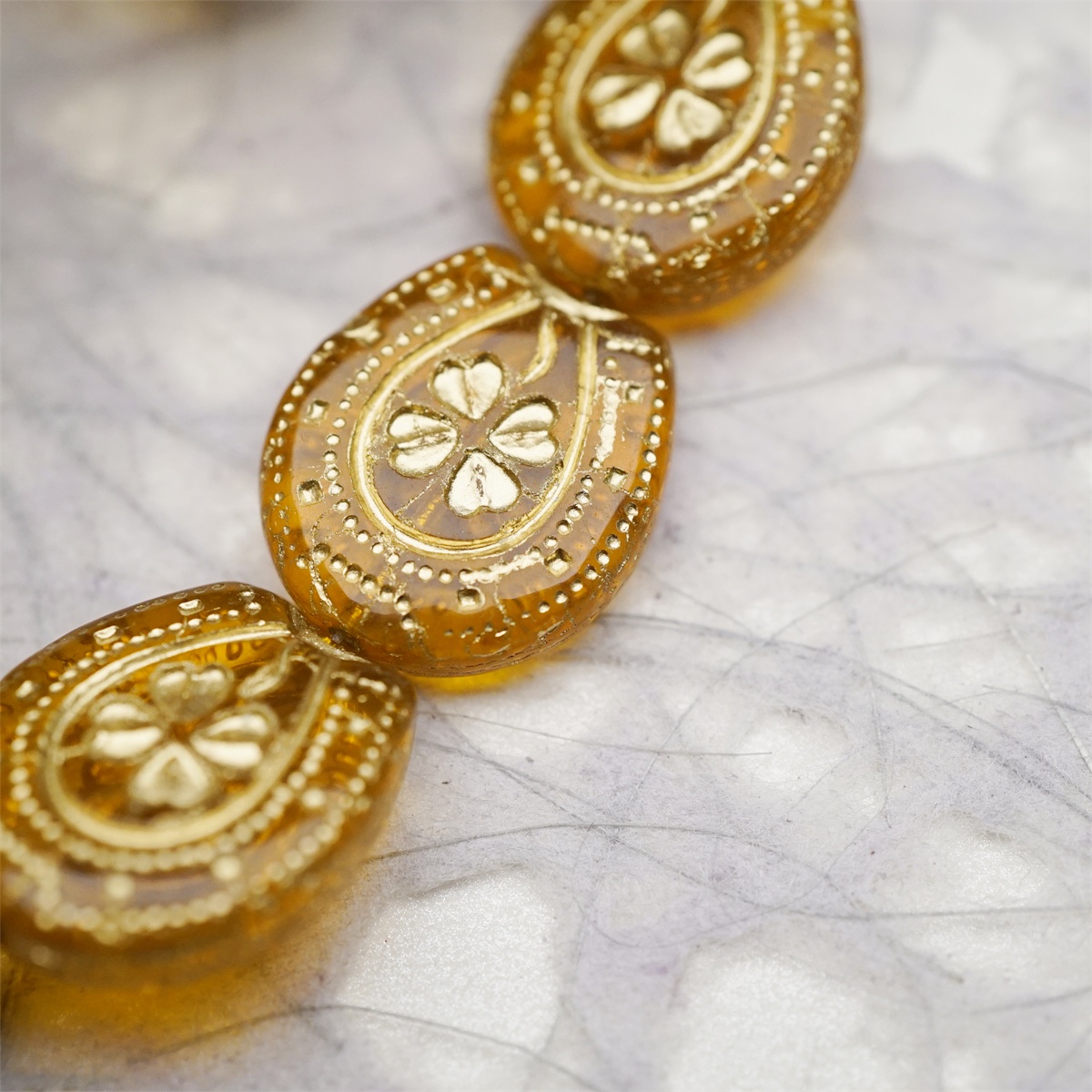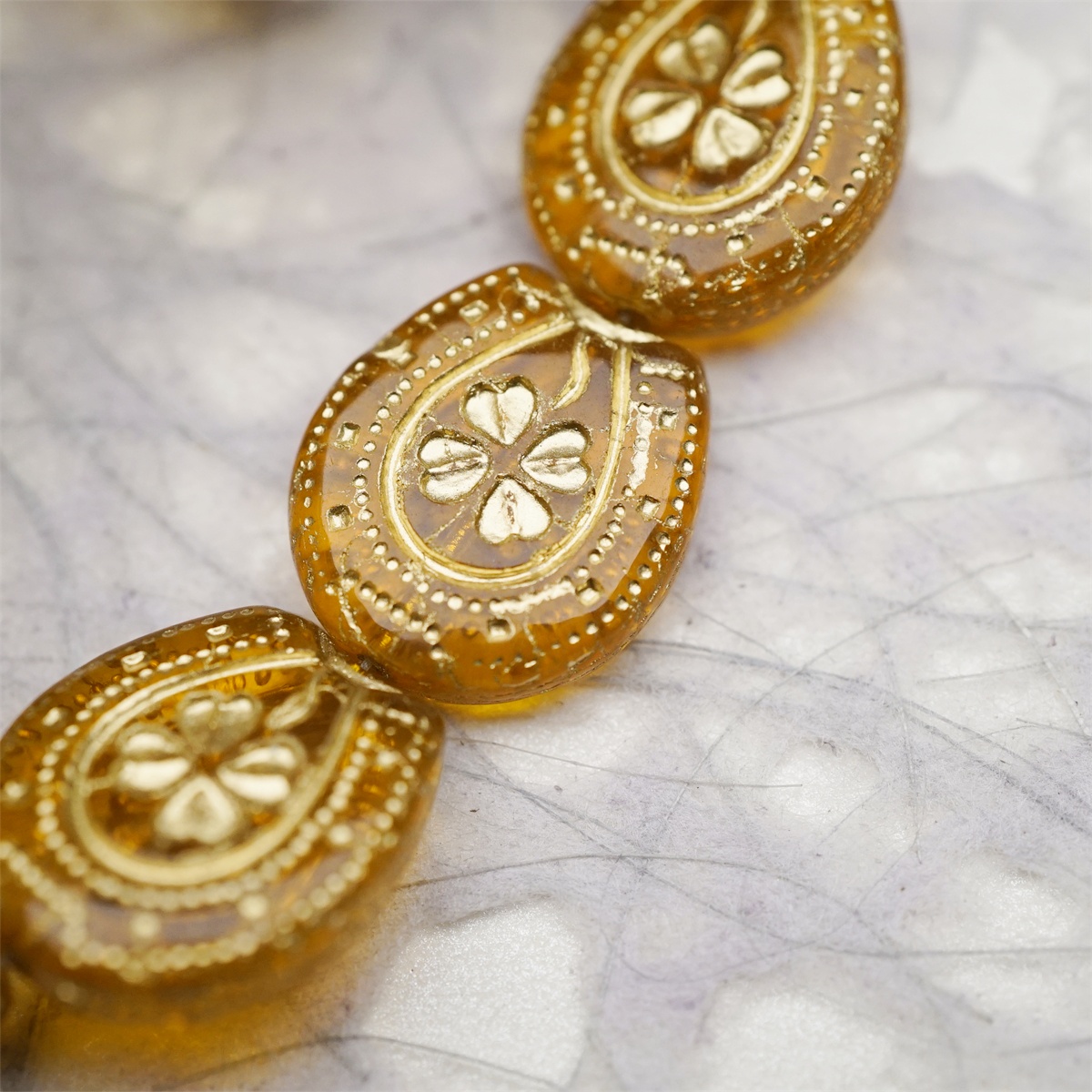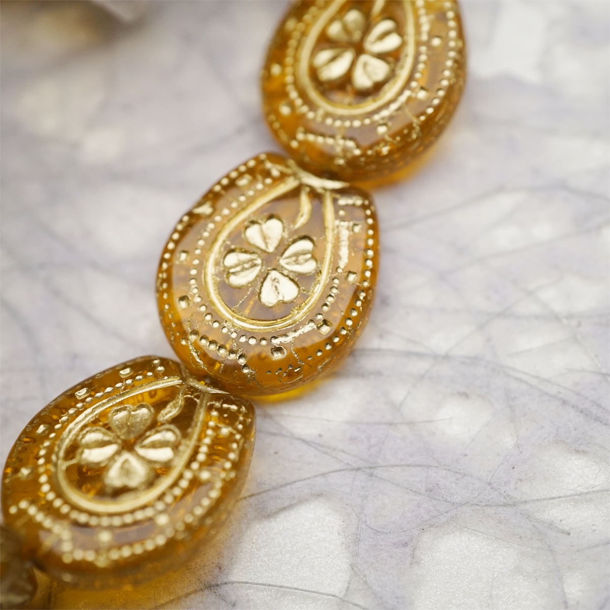 透琥珀色描金色~趣味马蹄铁形四叶草花纹捷克珠玻璃琉璃珠 21X18MM