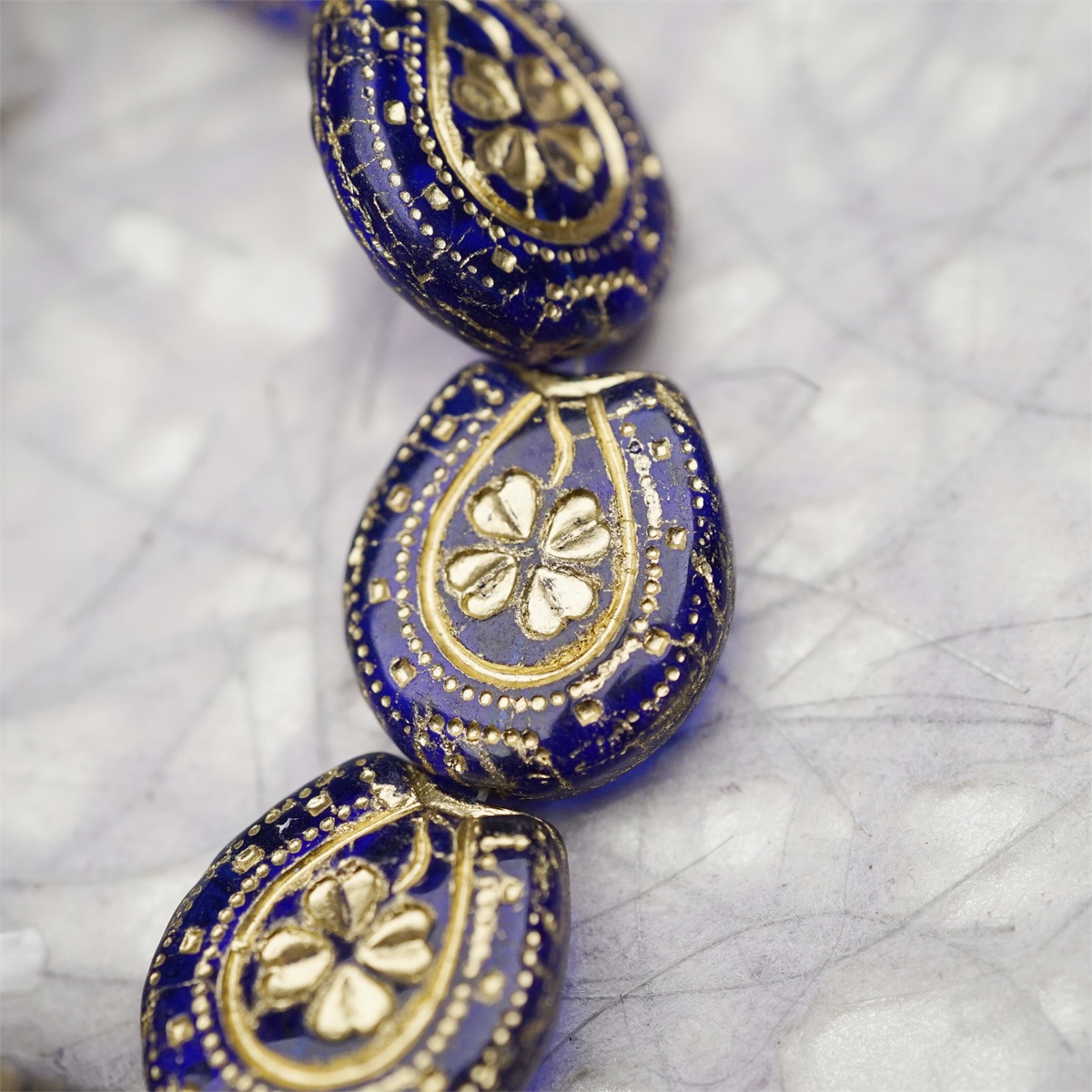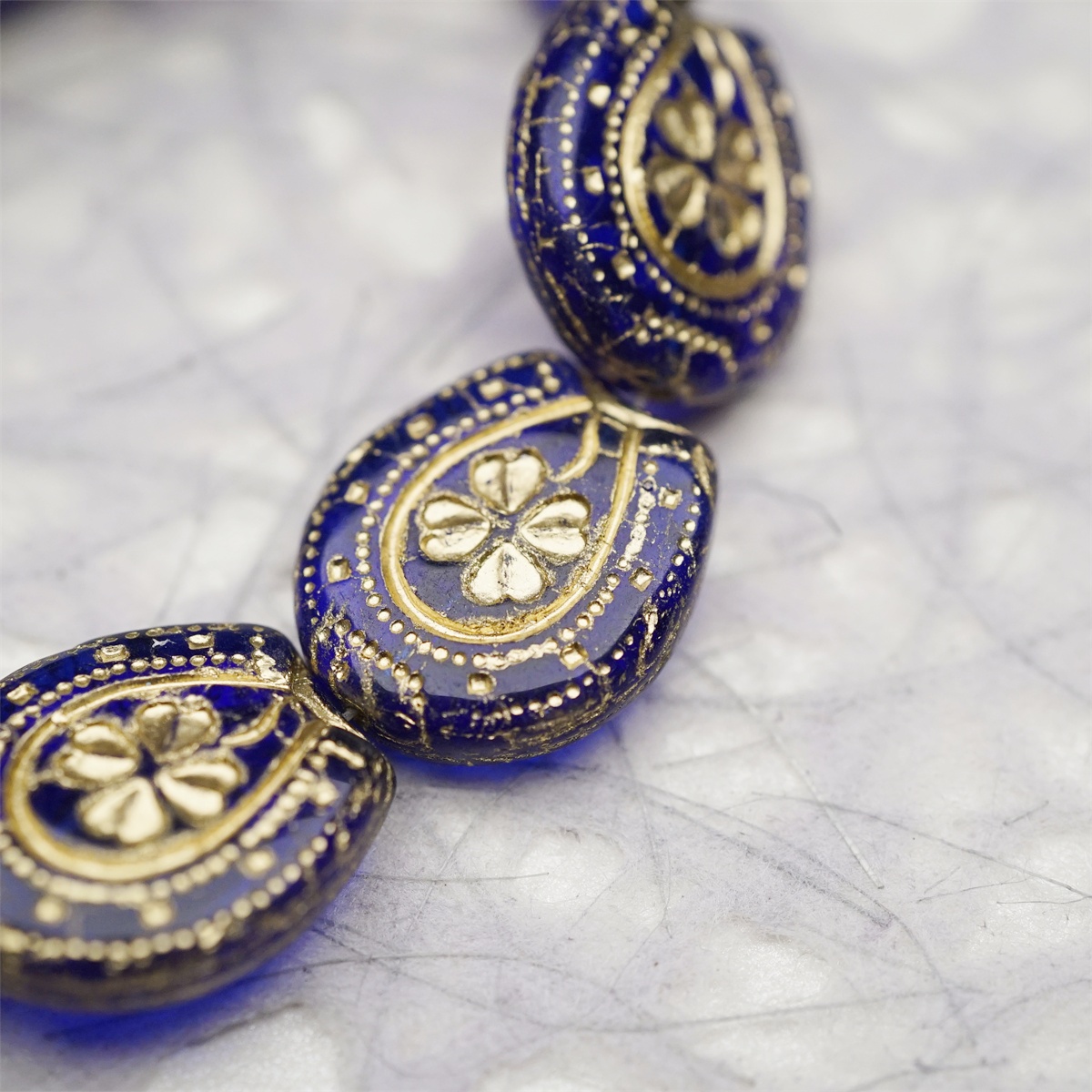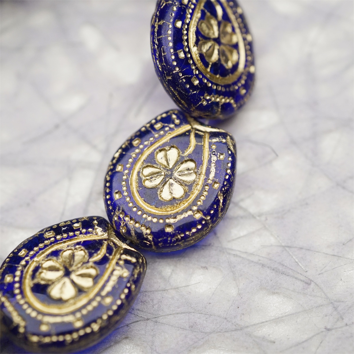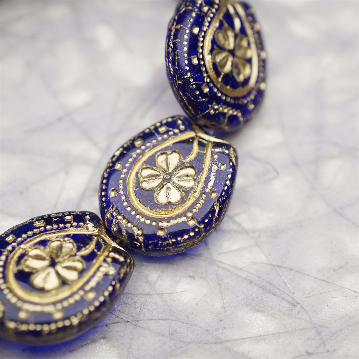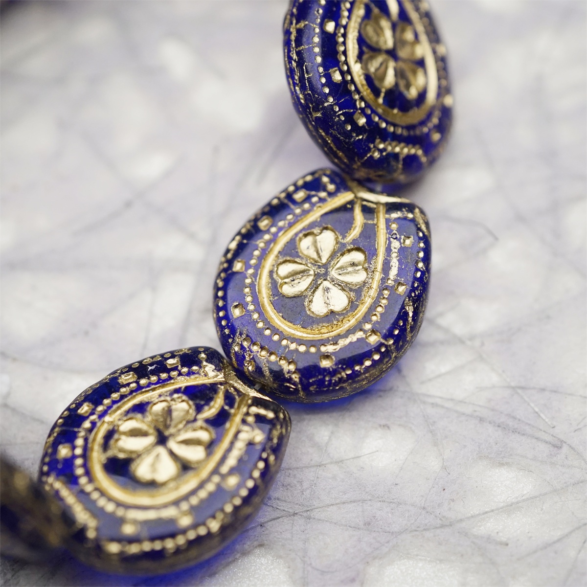 透暗夜蓝描金色~趣味马蹄铁形四叶草花纹捷克珠玻璃琉璃珠 21X18MM