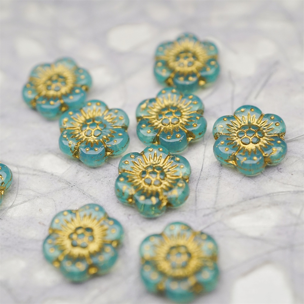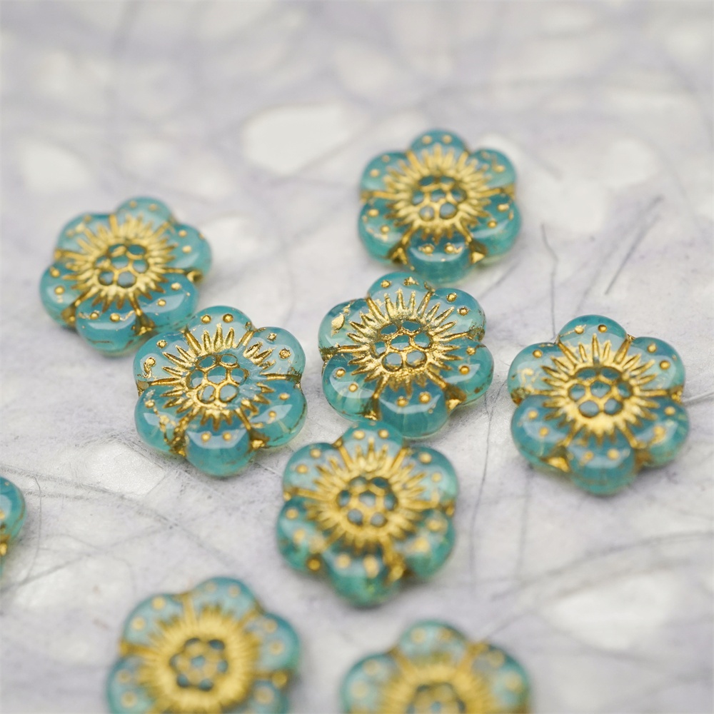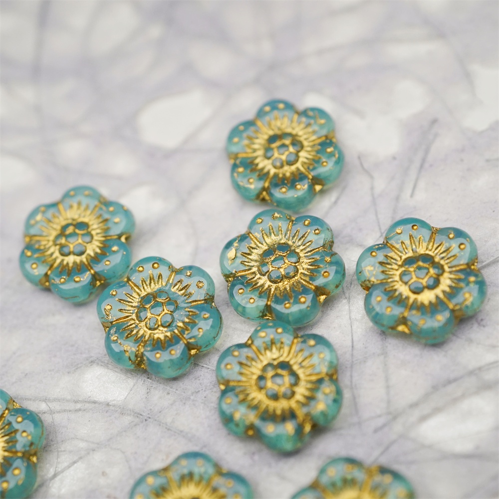 果冻蓝绿色描金~小号樱花捷克珠玻璃琉璃珠 14MM