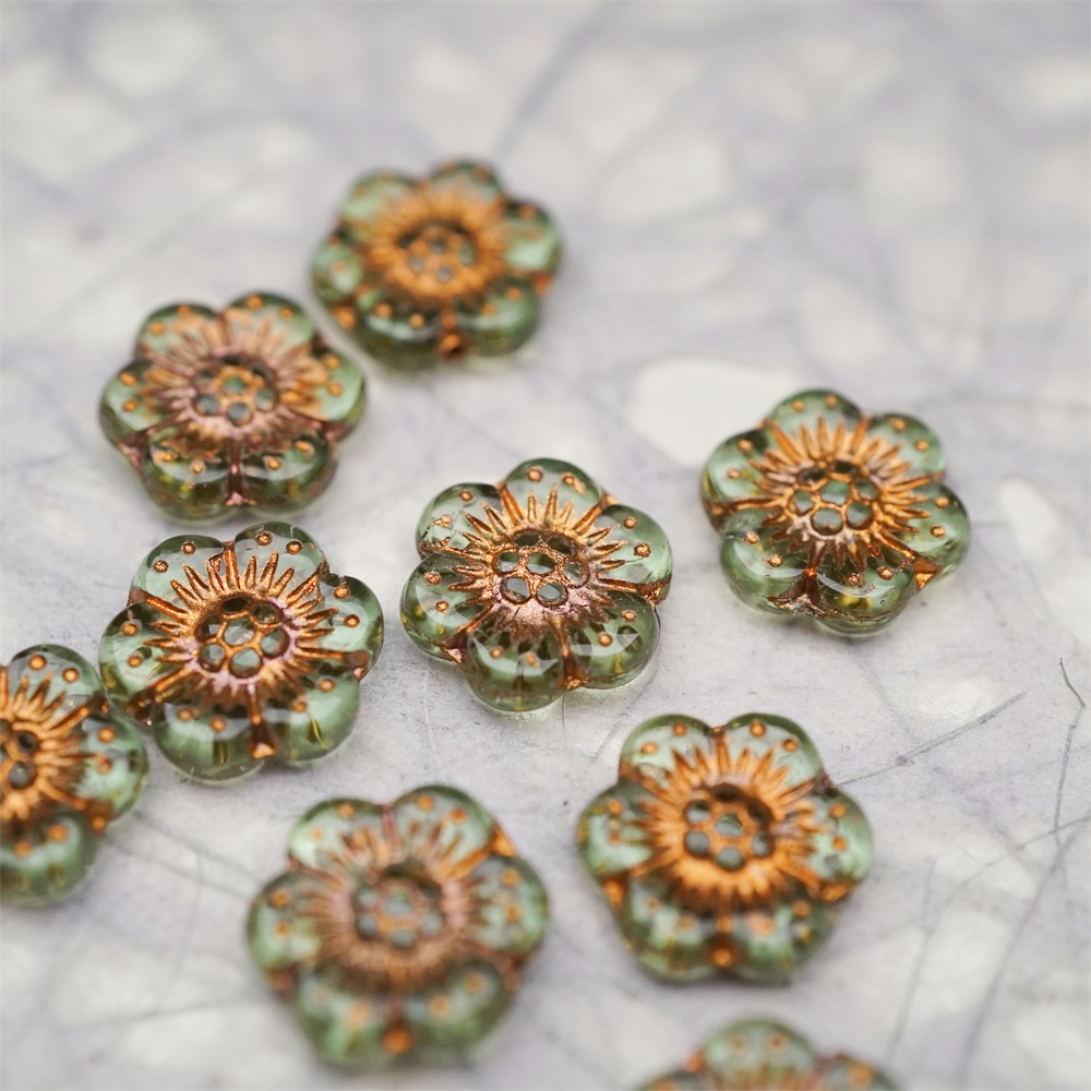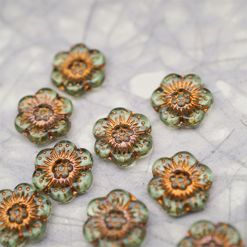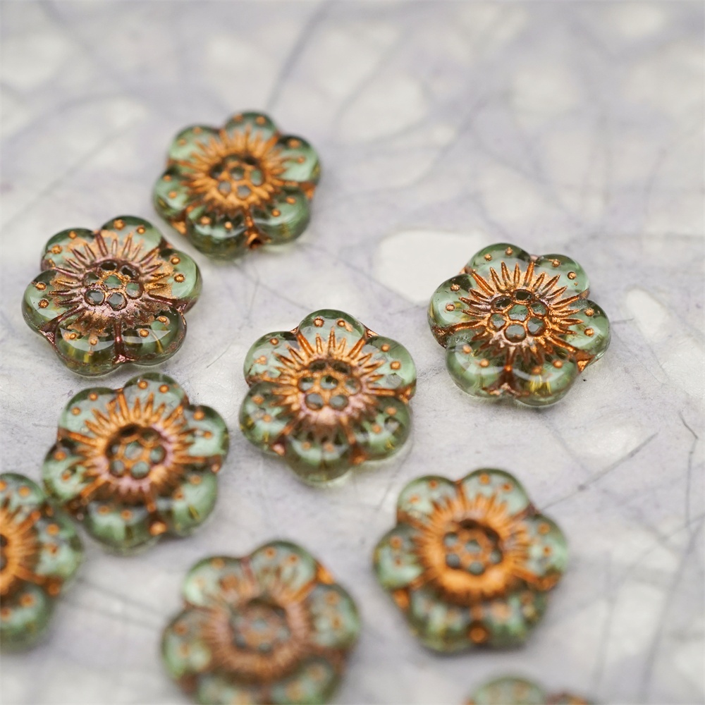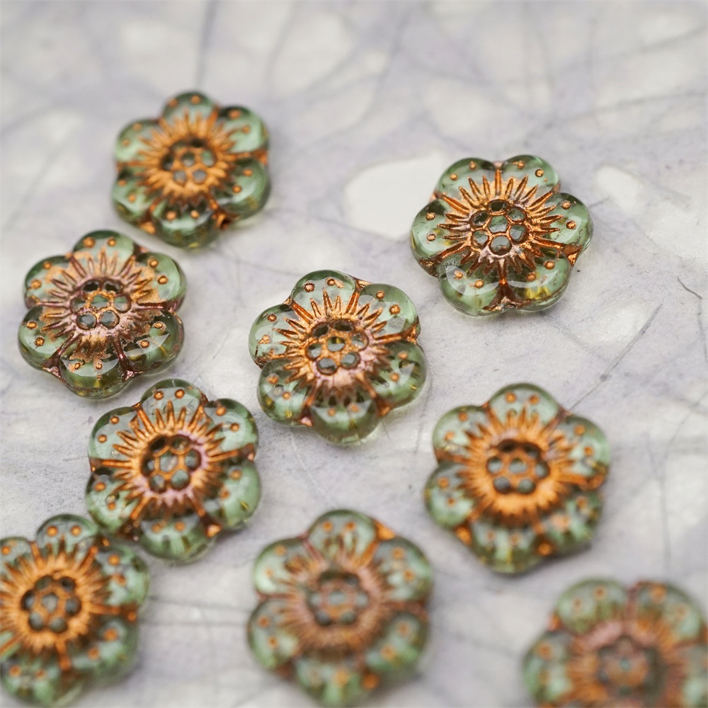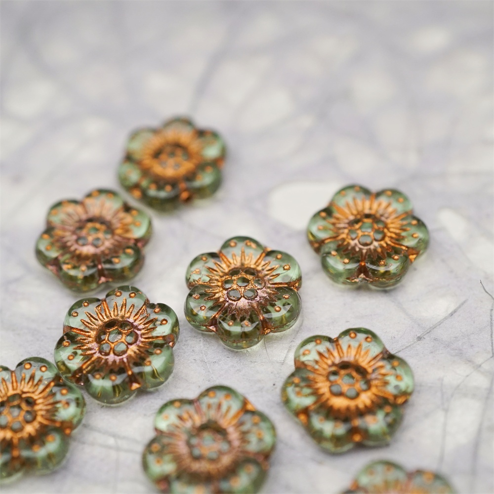 透浅浅绿色描古铜金~小号樱花捷克珠玻璃琉璃珠 14MM