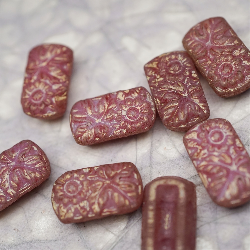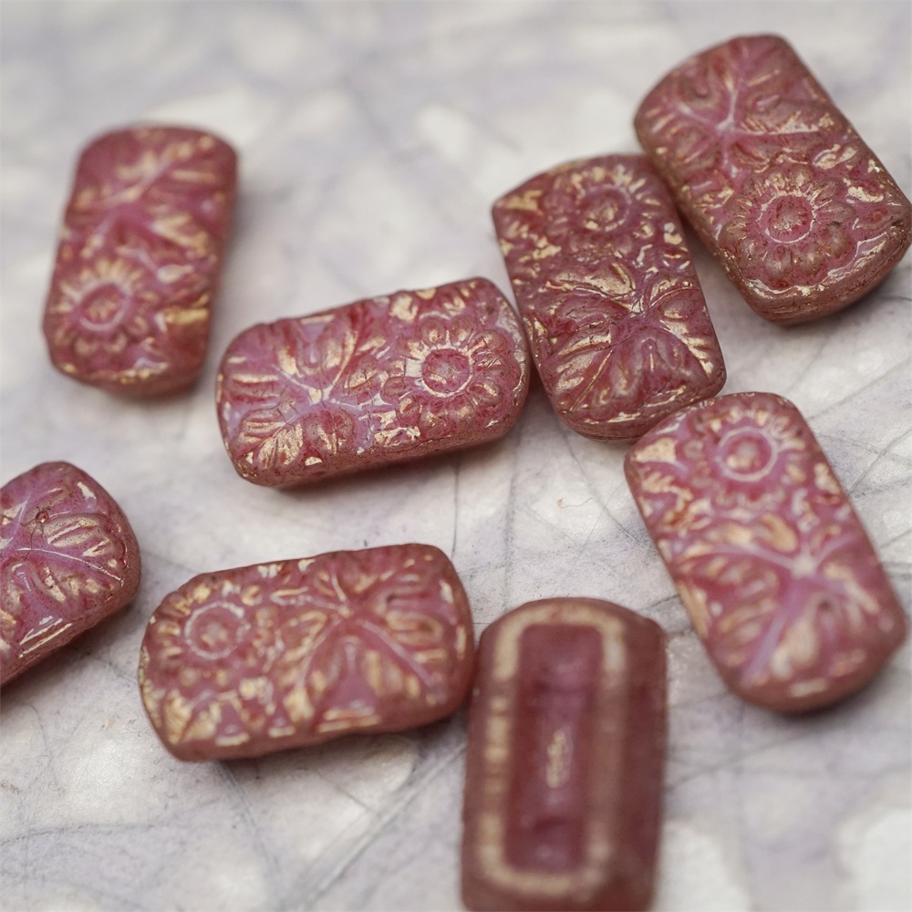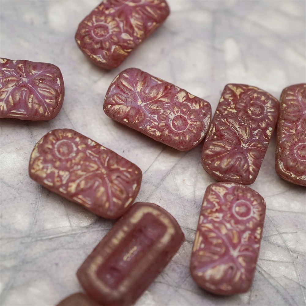 复古斑驳深粉色~双孔方形古董珠型浮雕向日葵花朵花纹捷克珠玻璃琉璃珠 19X11MM