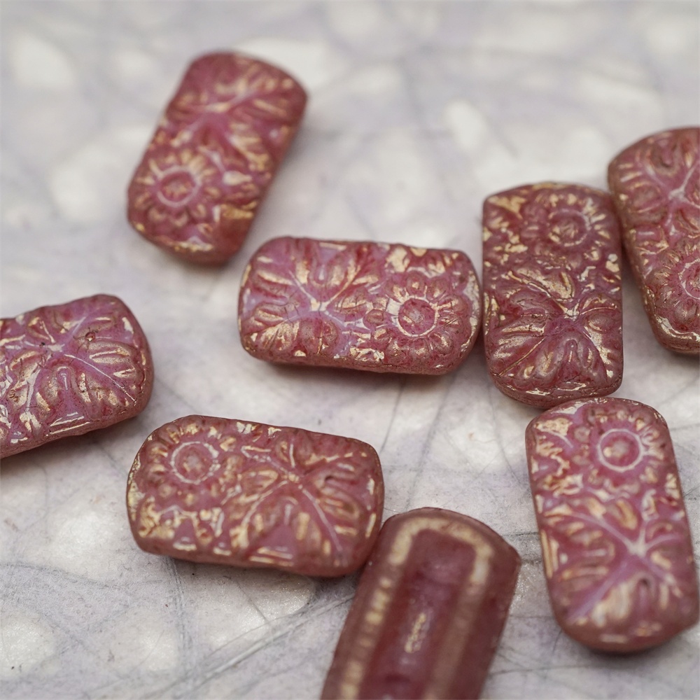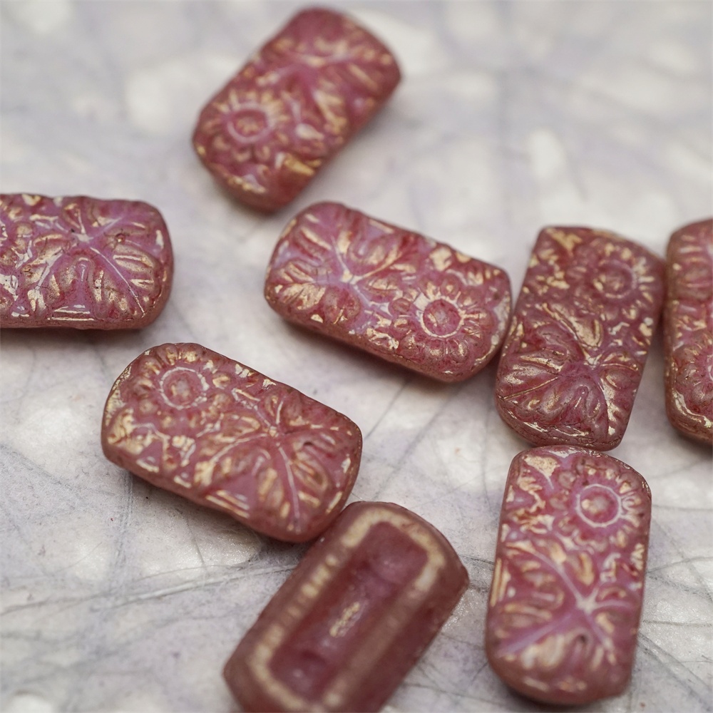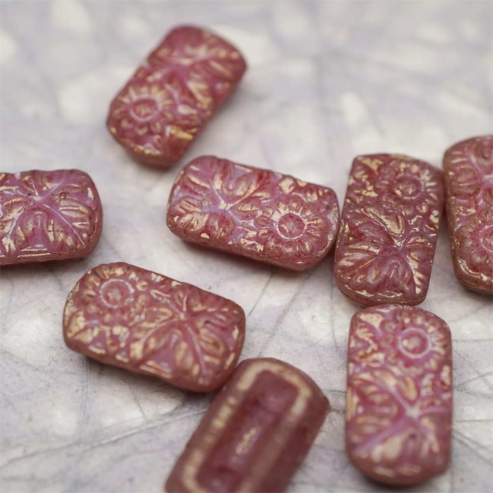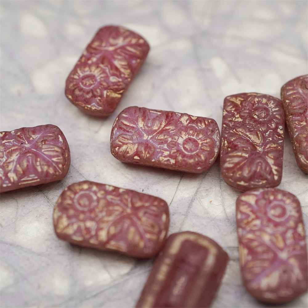 复古斑驳深粉色~双孔方形古董珠型浮雕向日葵花朵花纹捷克珠玻璃琉璃珠 19X11MM
