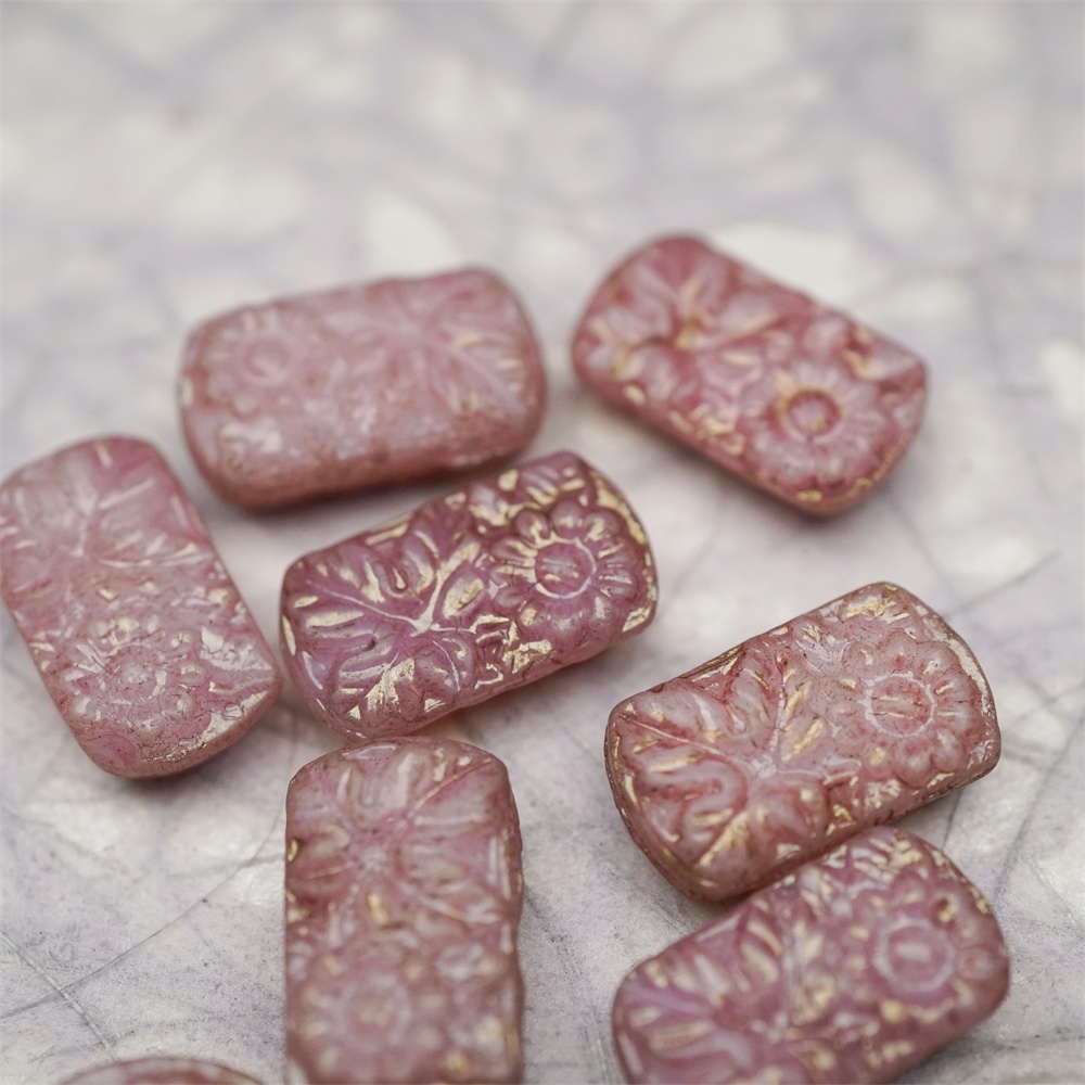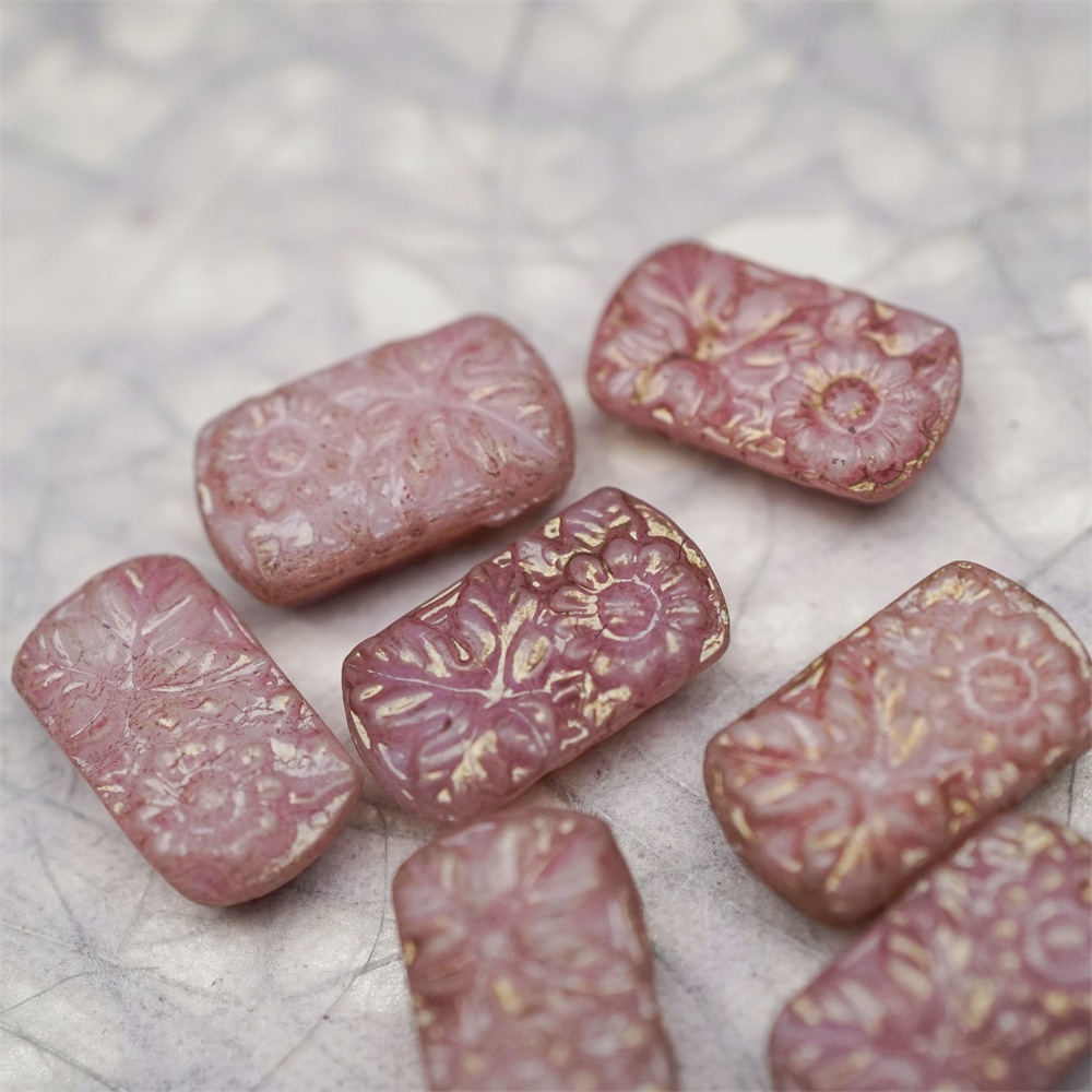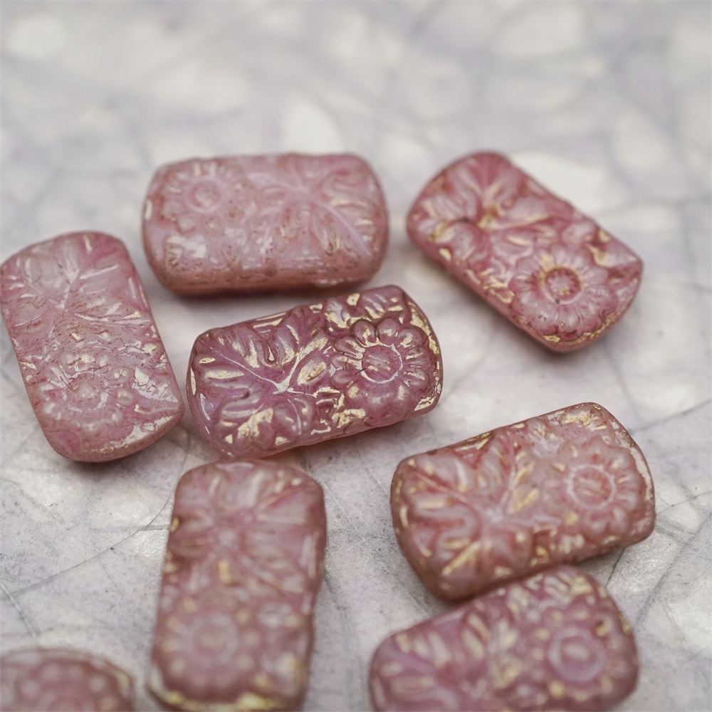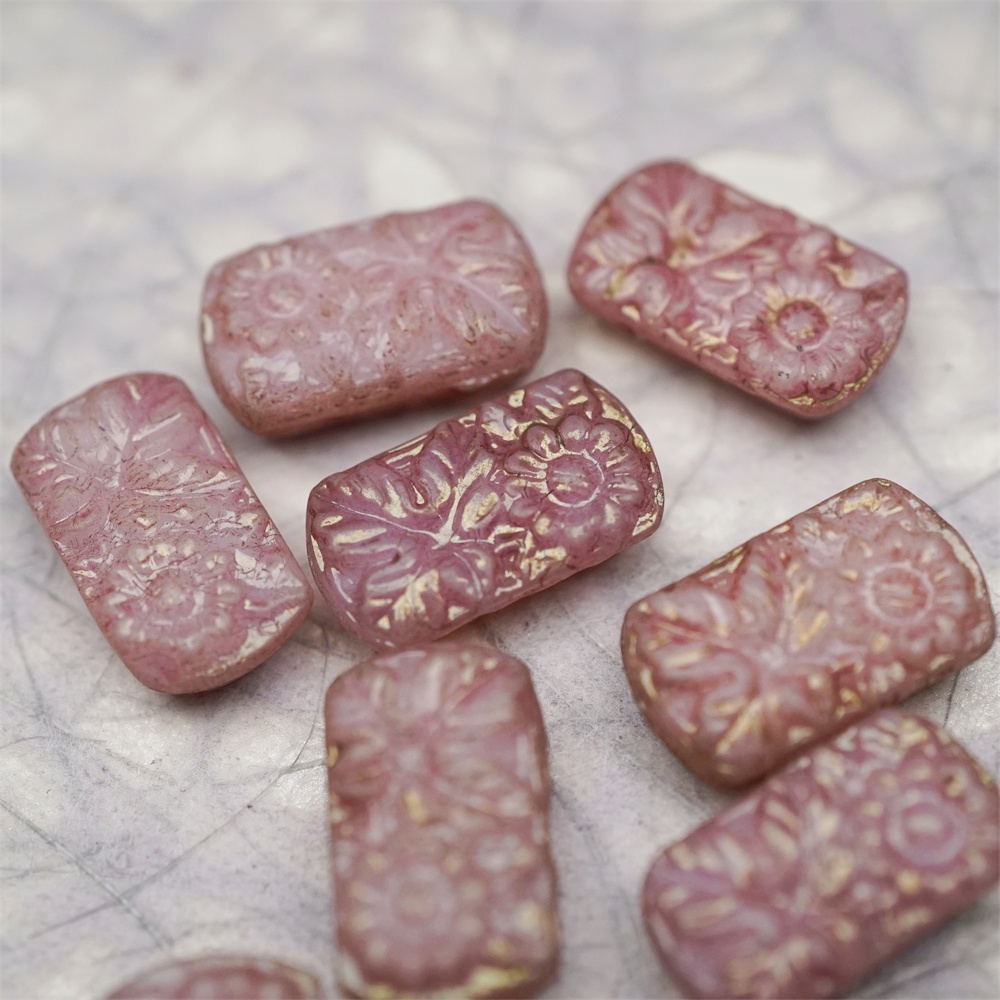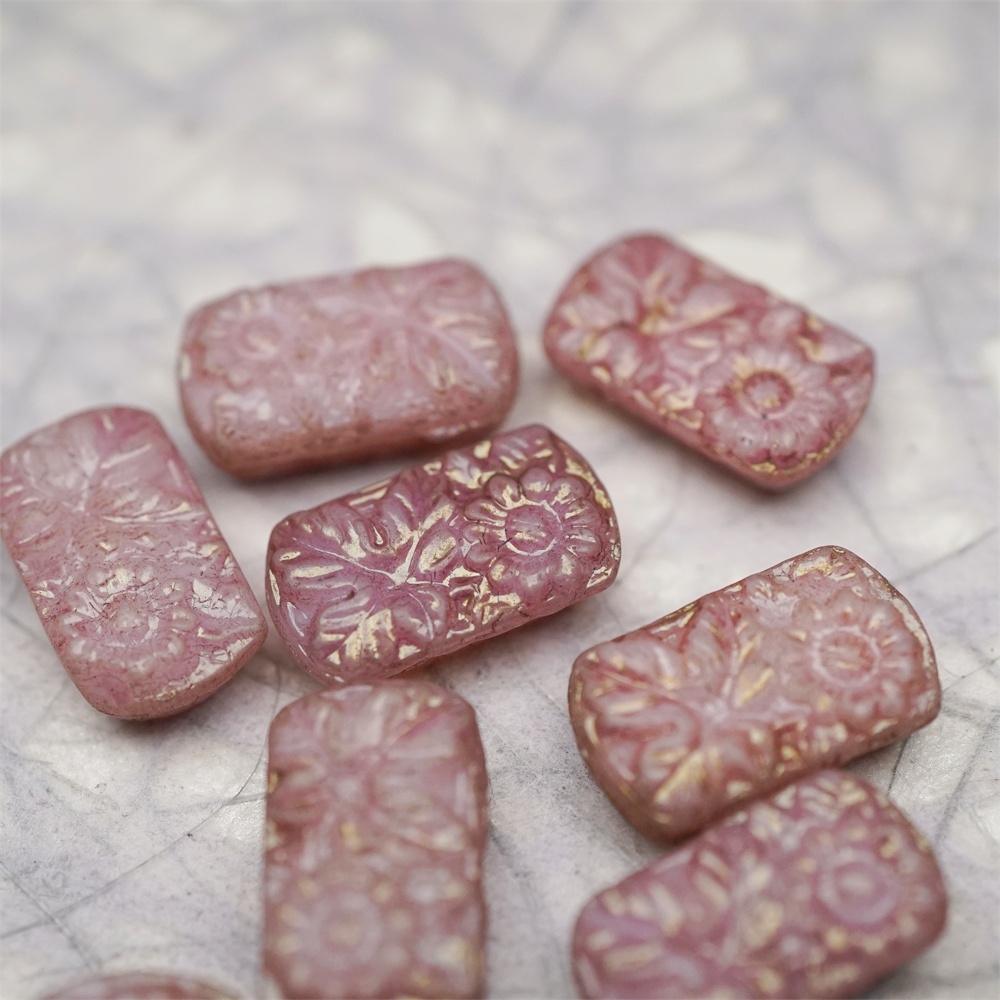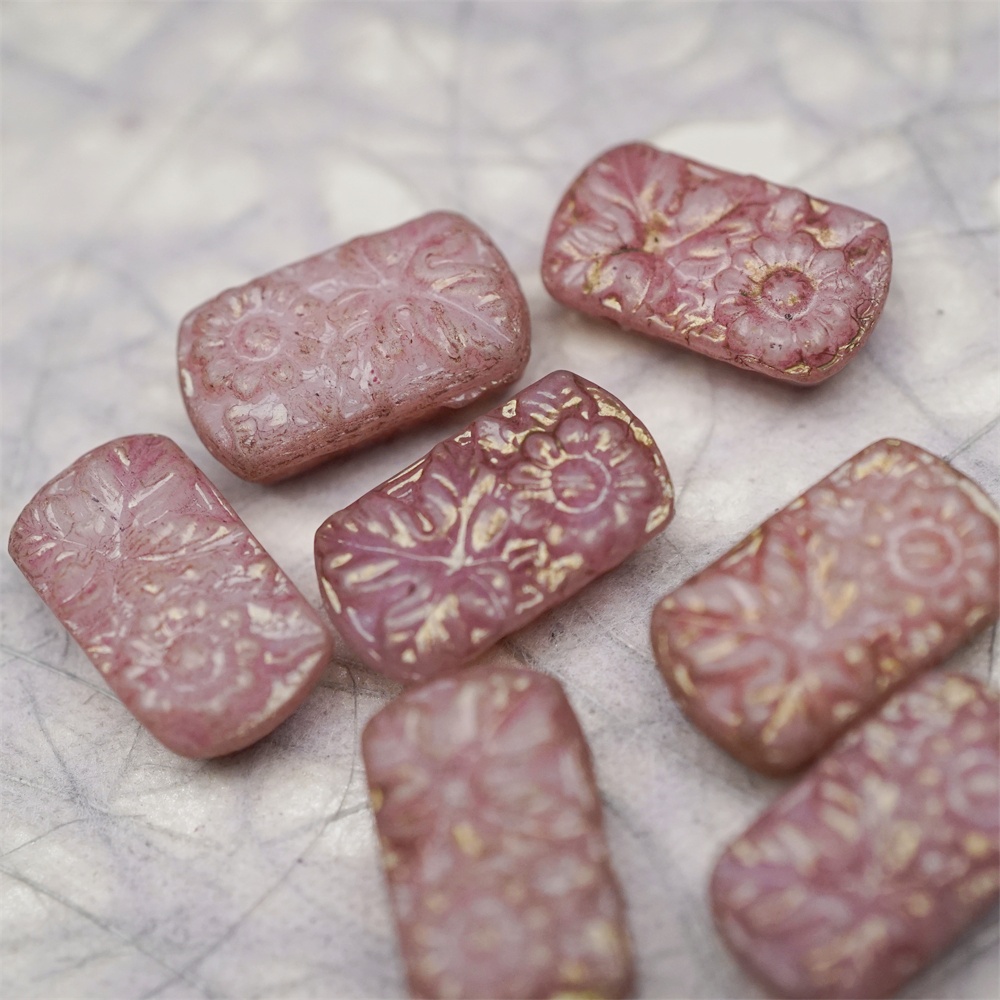 复古斑驳浅粉色~双孔方形古董珠型浮雕向日葵花朵花纹捷克珠玻璃琉璃珠 19X11MM