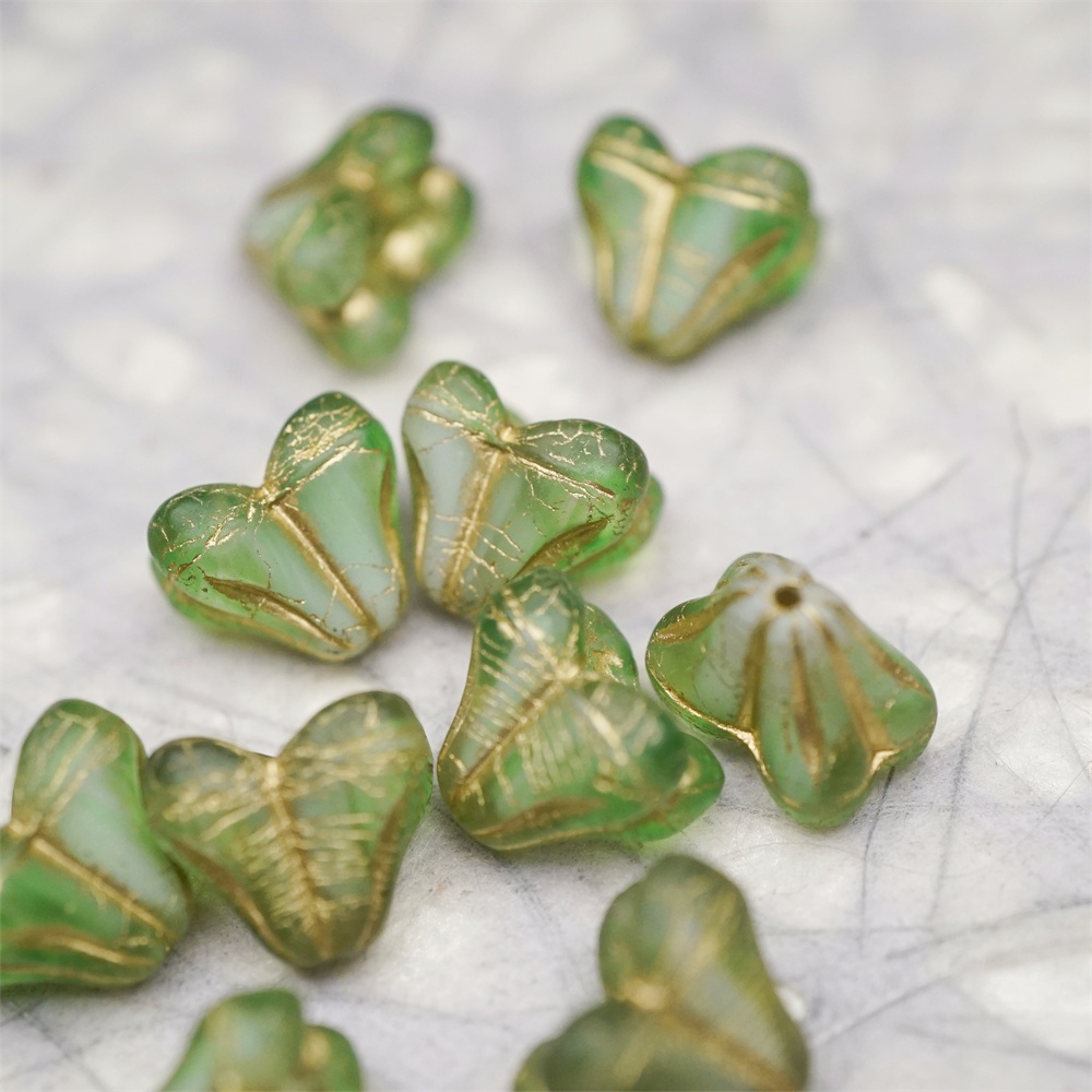雾面复古绿白色夹心mix描金色~铃兰扁形古董珠形四叶花托捷克珠玻璃珠琉璃珠 9X13MM