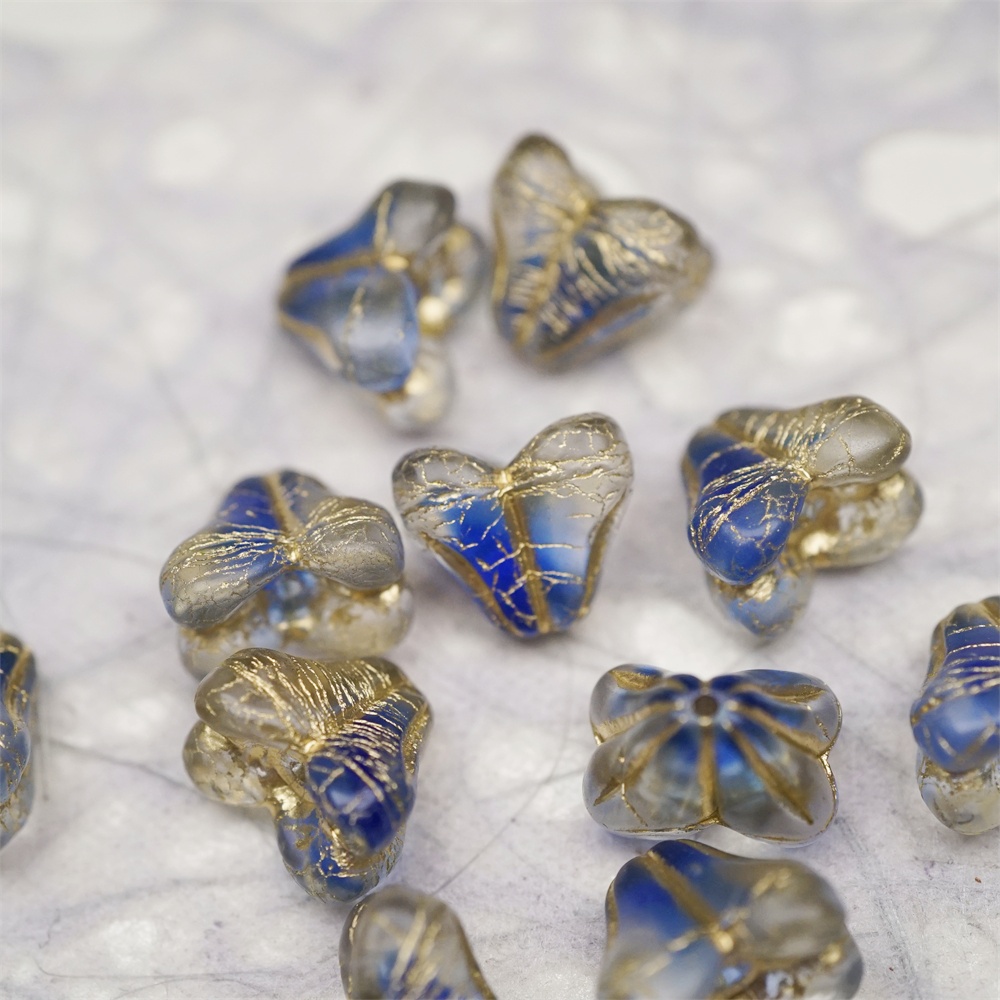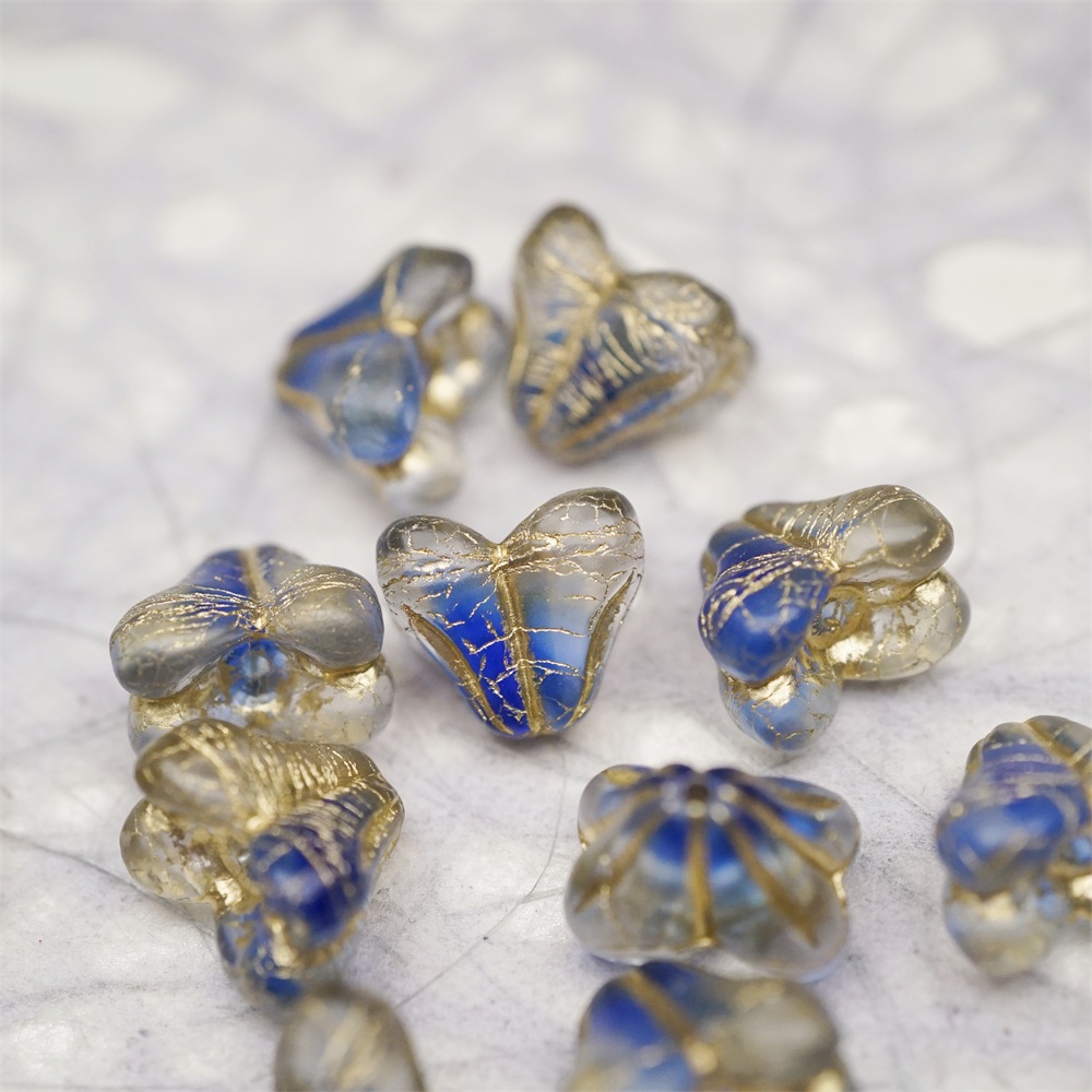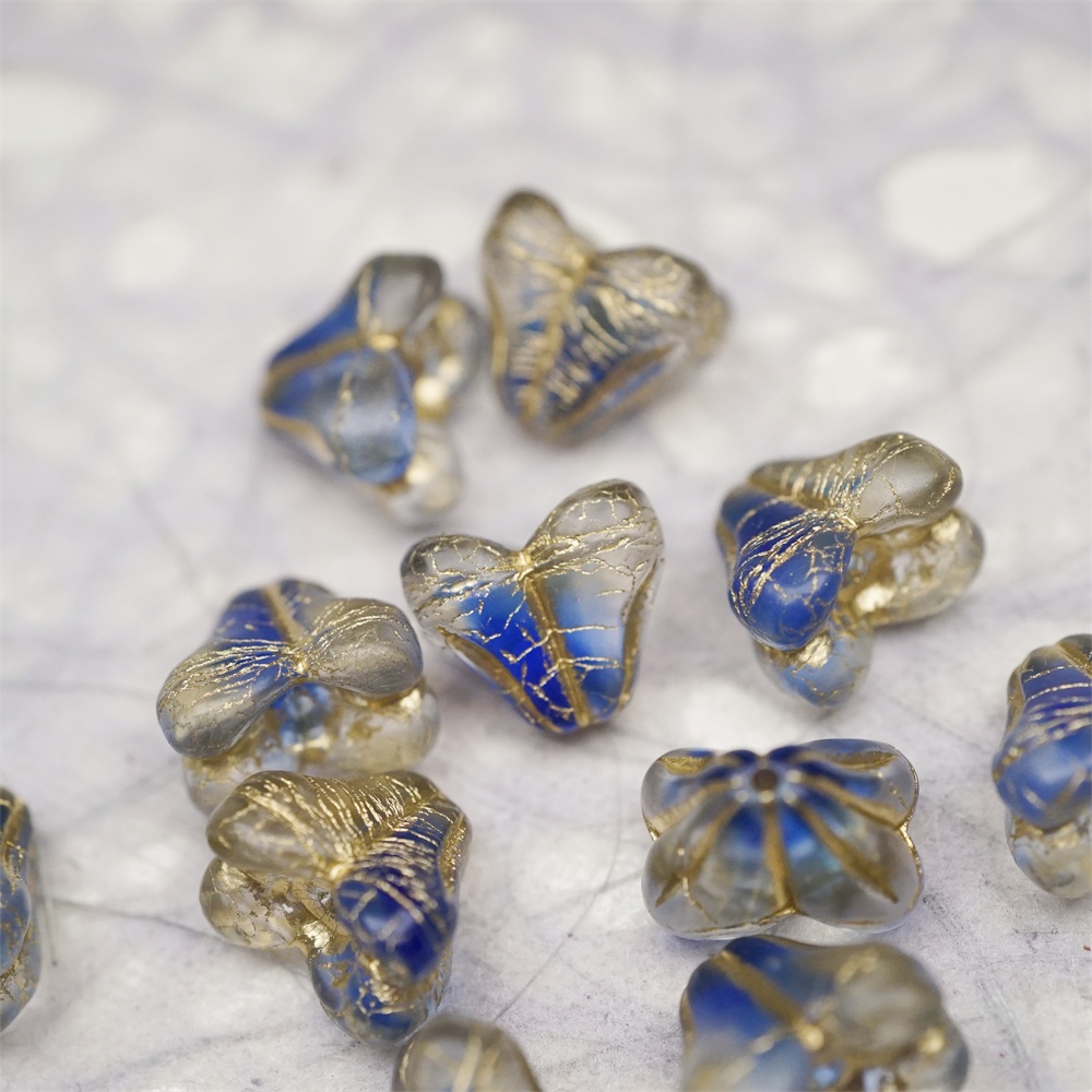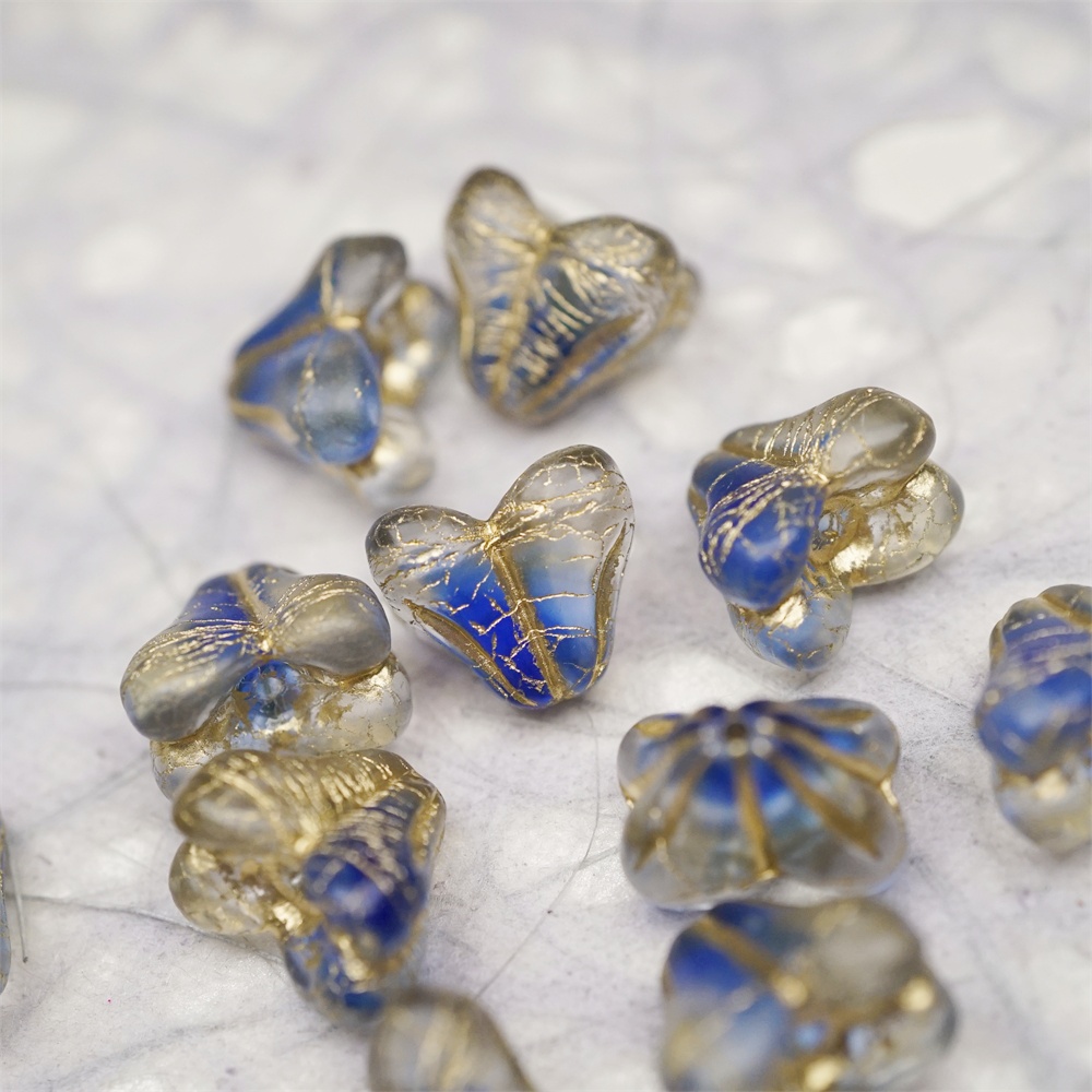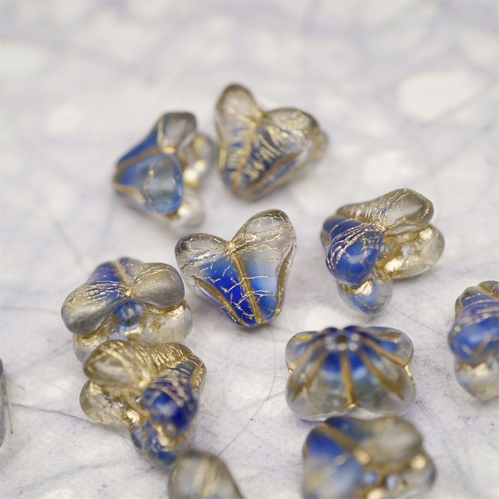雾面透明钴蓝夹心mix描金色~铃兰扁形古董珠形四叶花托捷克珠玻璃珠琉璃珠 9X13MM