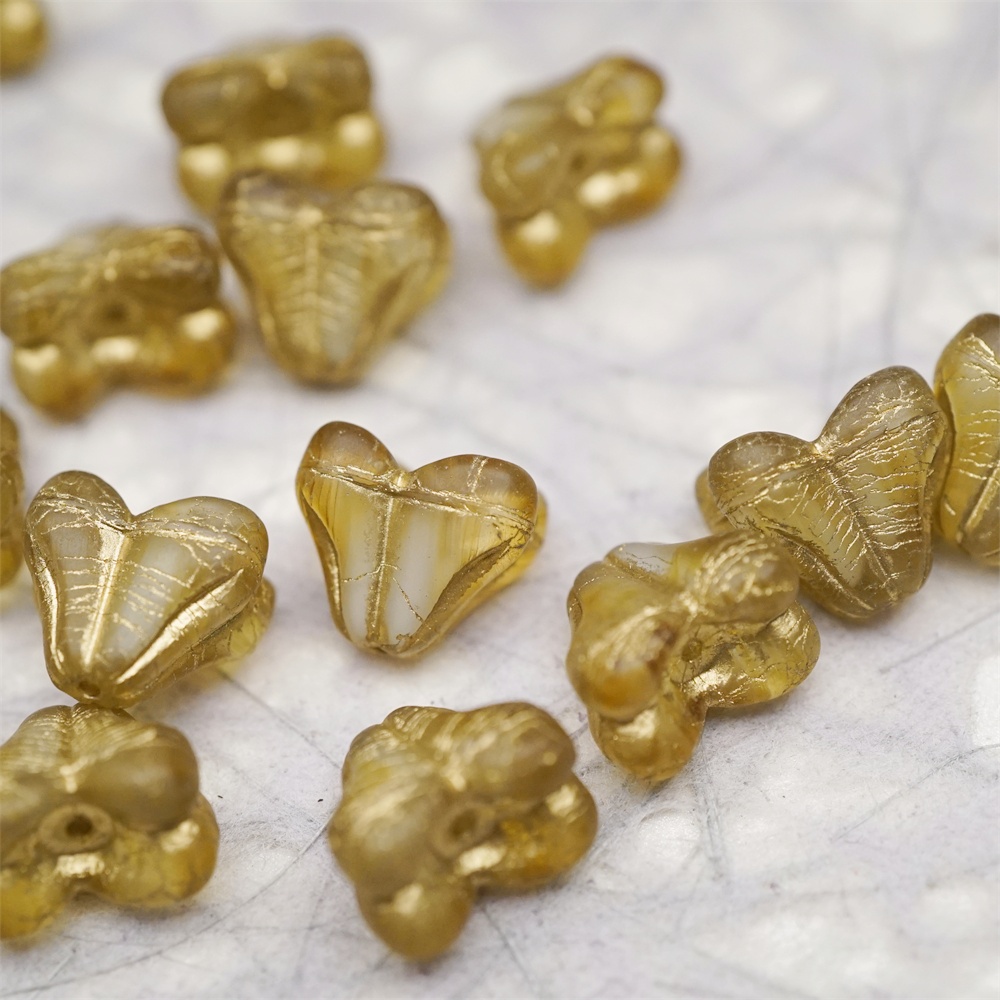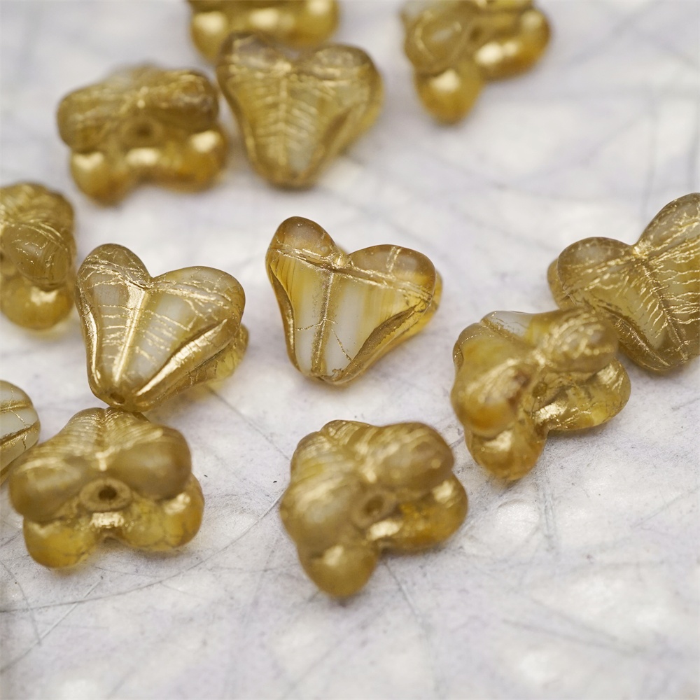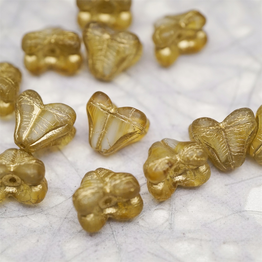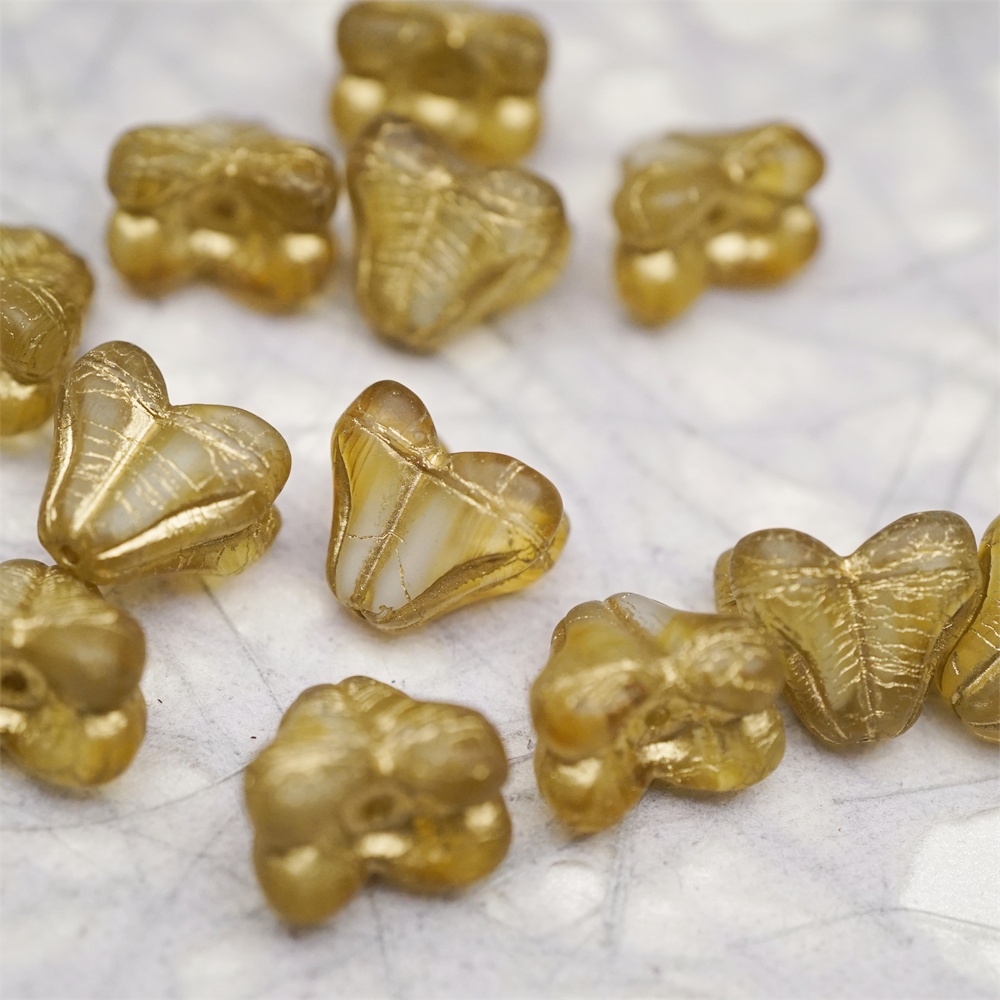 雾面蜂蜜黄白夹心mix描金色~铃兰扁形古董珠形四叶花托捷克珠玻璃珠琉璃珠 9X13MM