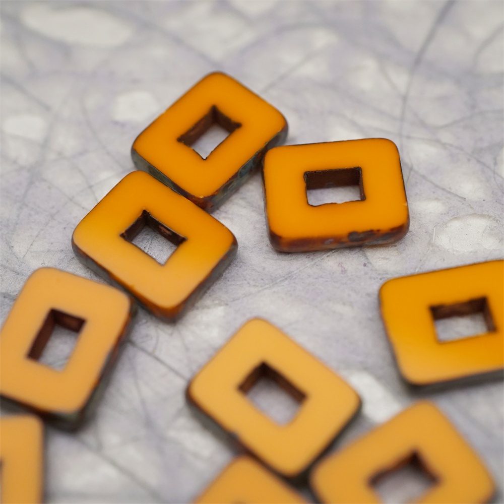 实色橘色做旧毕加索边边~空心方块长方形大孔平安扣型捷克珠玻璃琉璃珠 12X16MM