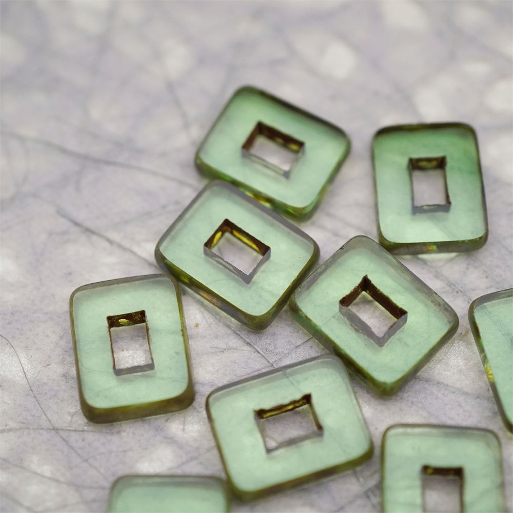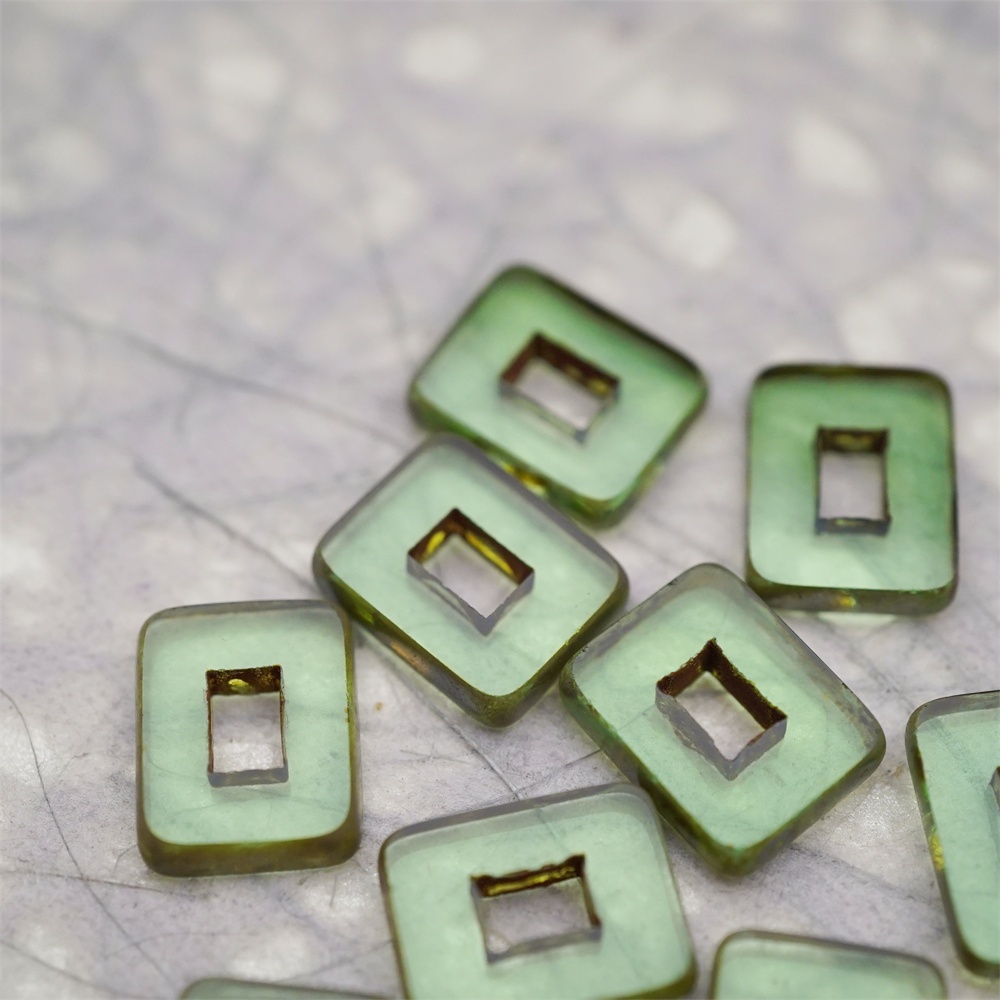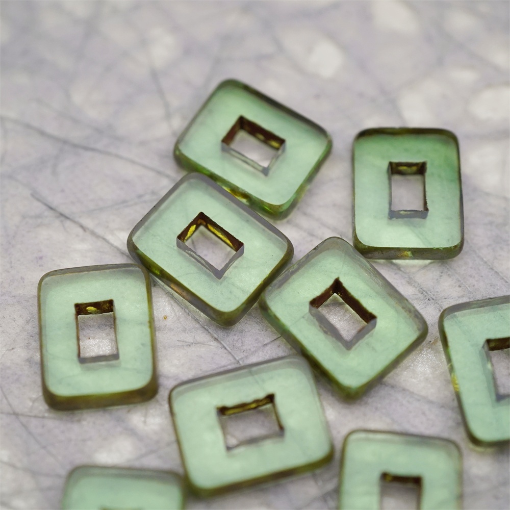 透水绿色做旧毕加索边边~空心方块长方形大孔平安扣型捷克珠玻璃琉璃珠 12X16MM