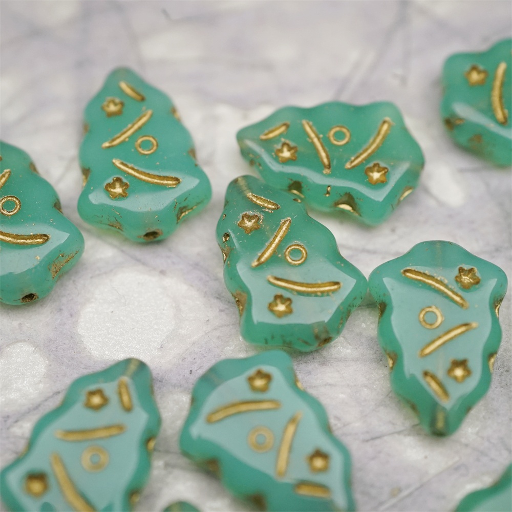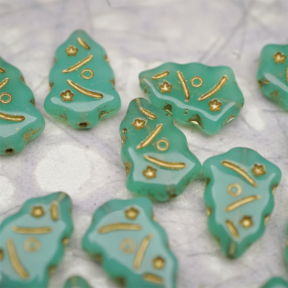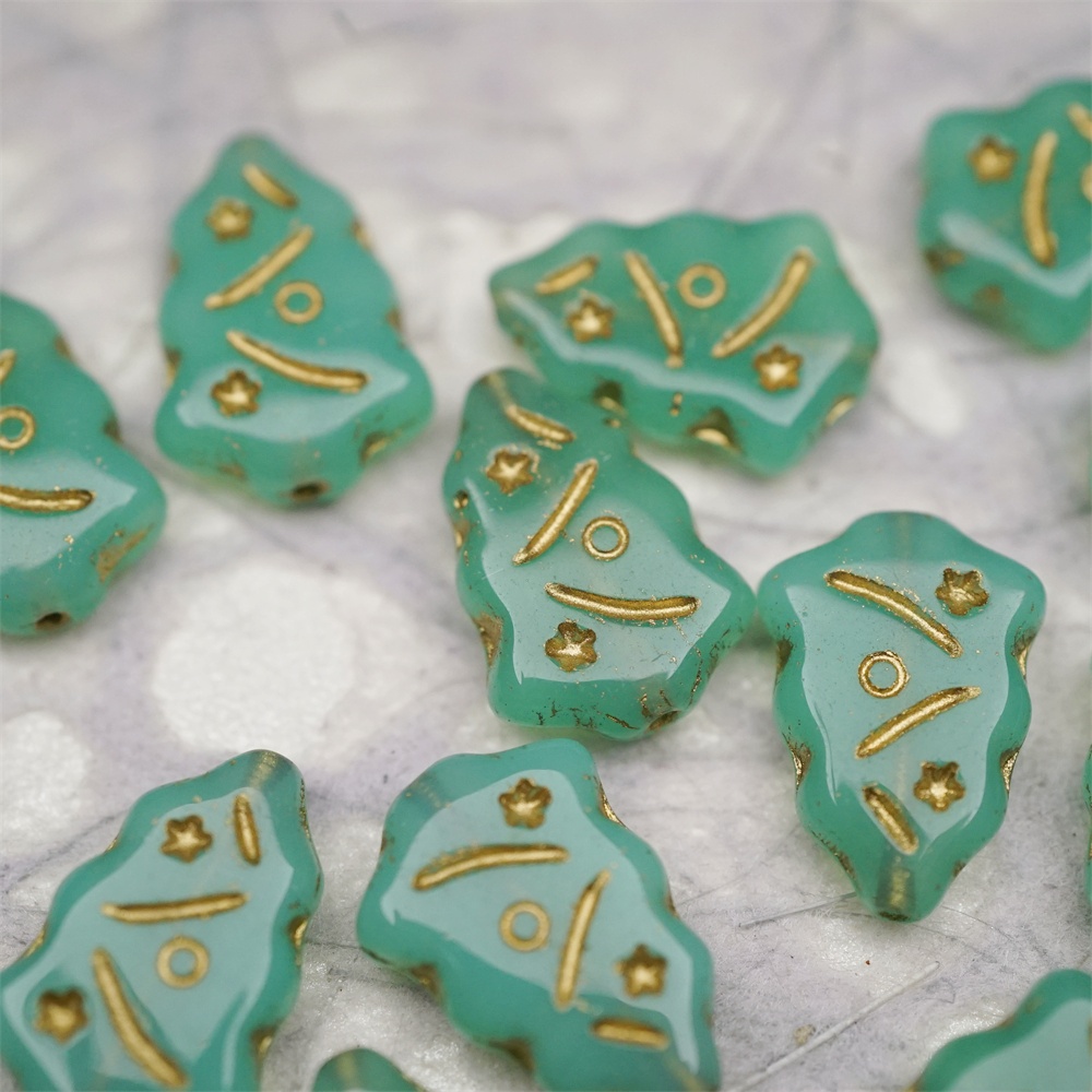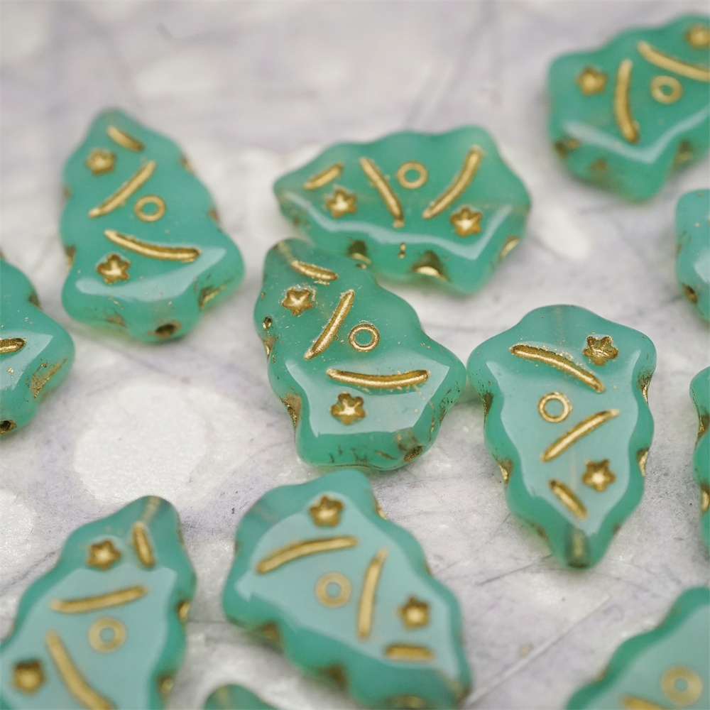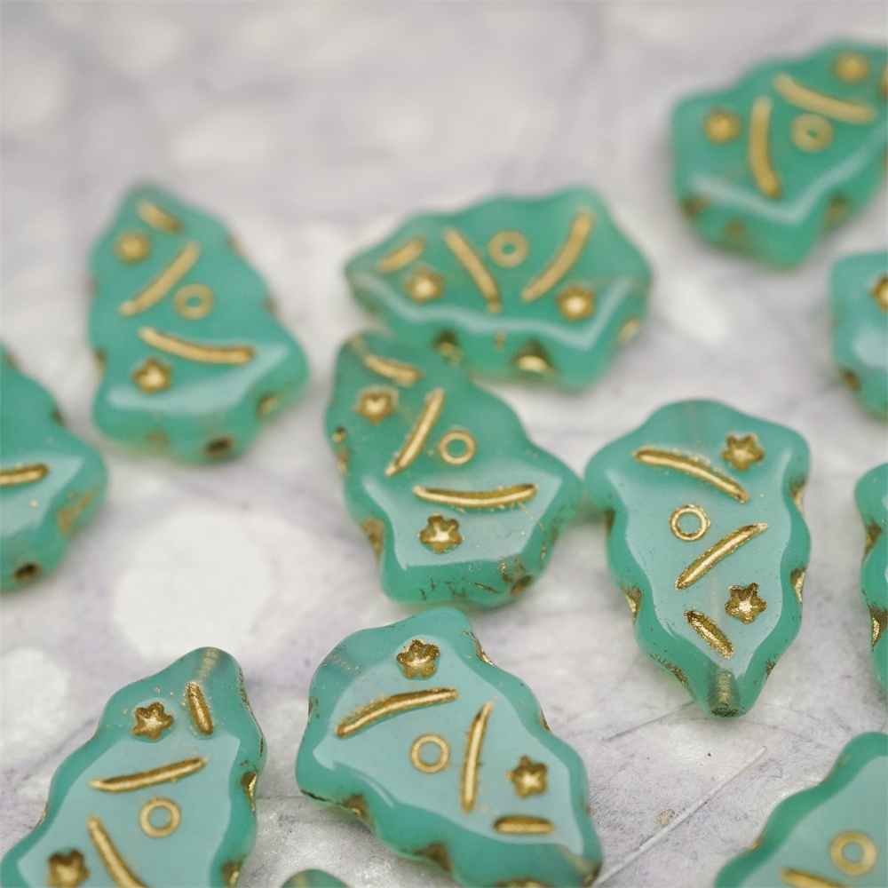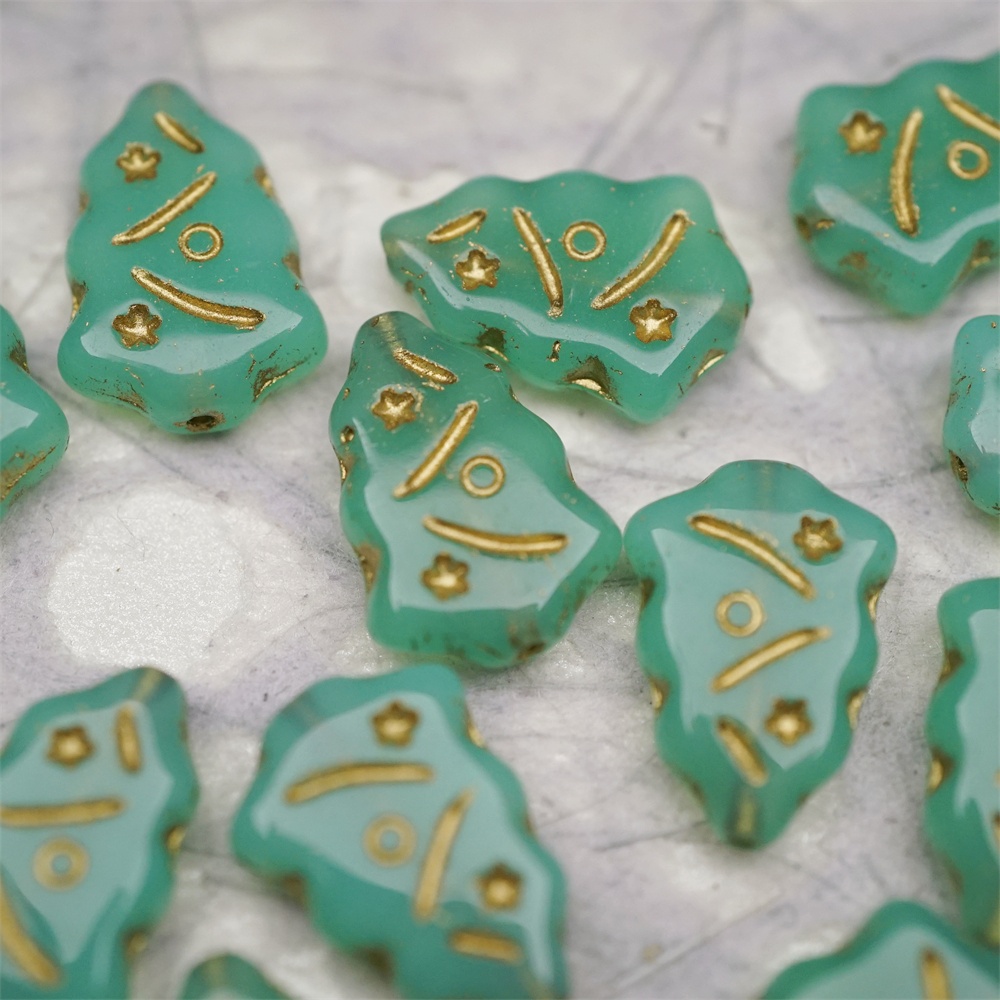 复古蛋白绿描金色~圣诞树捷克珠玻璃琉璃珠17X12MM