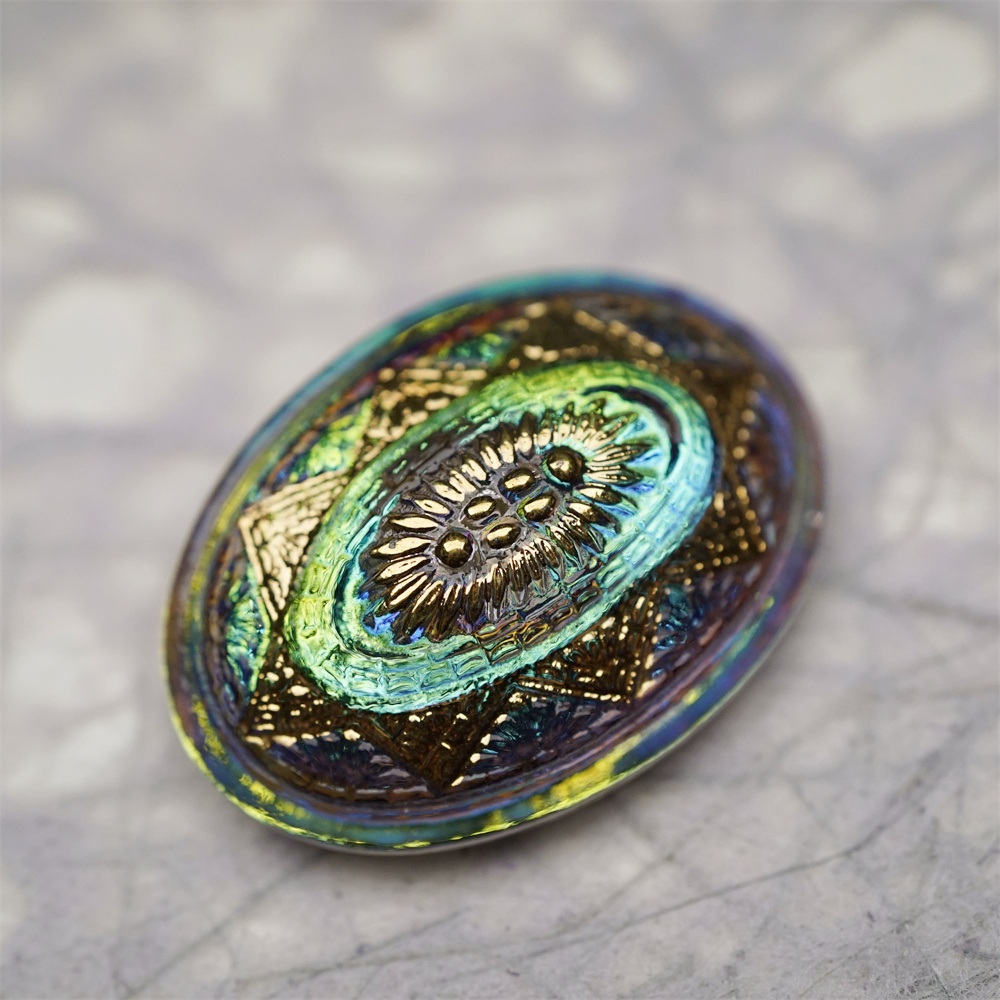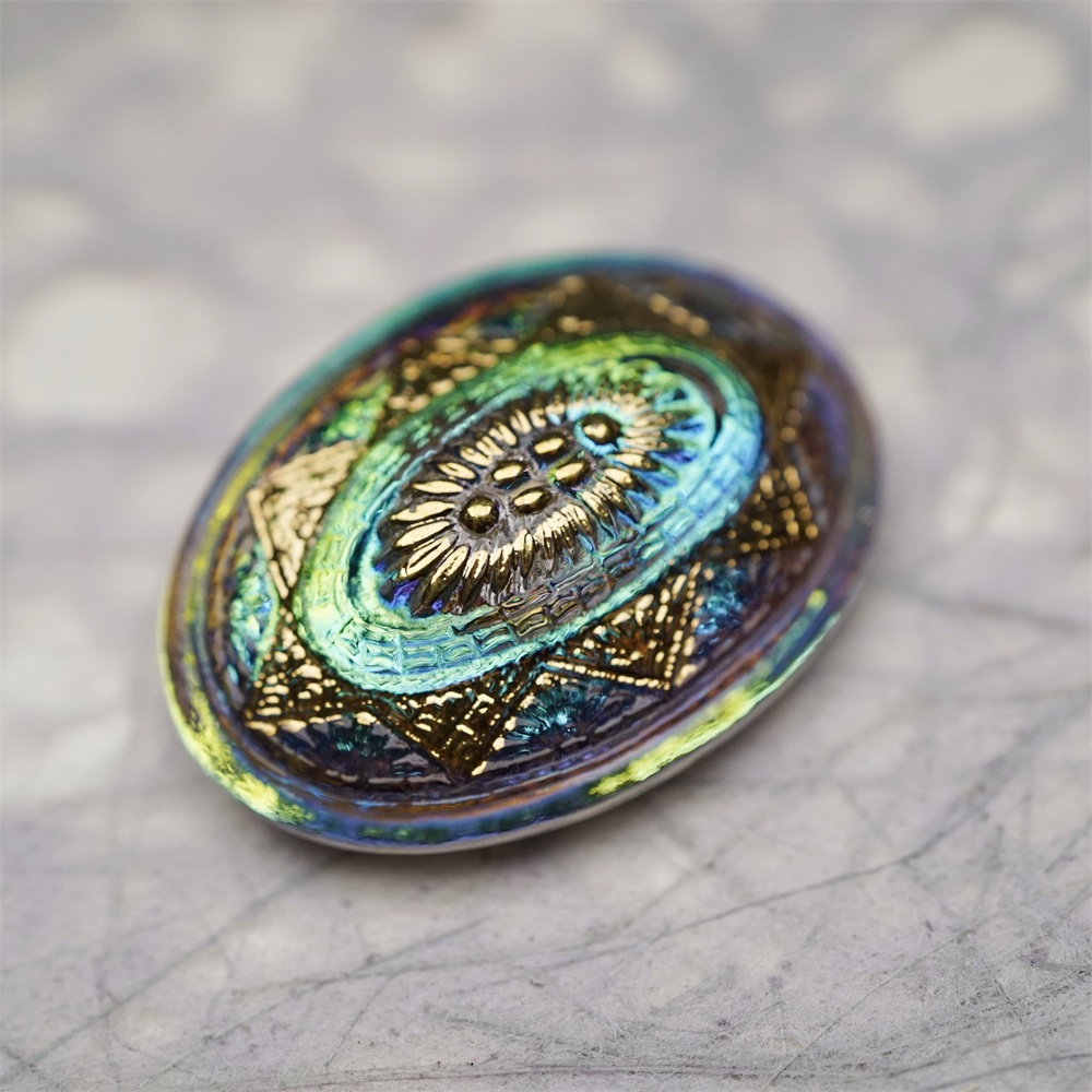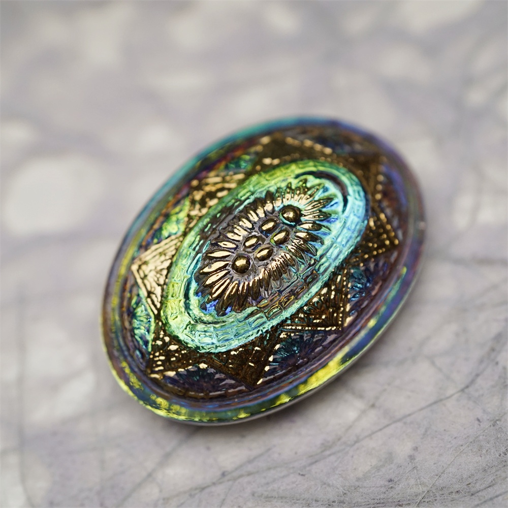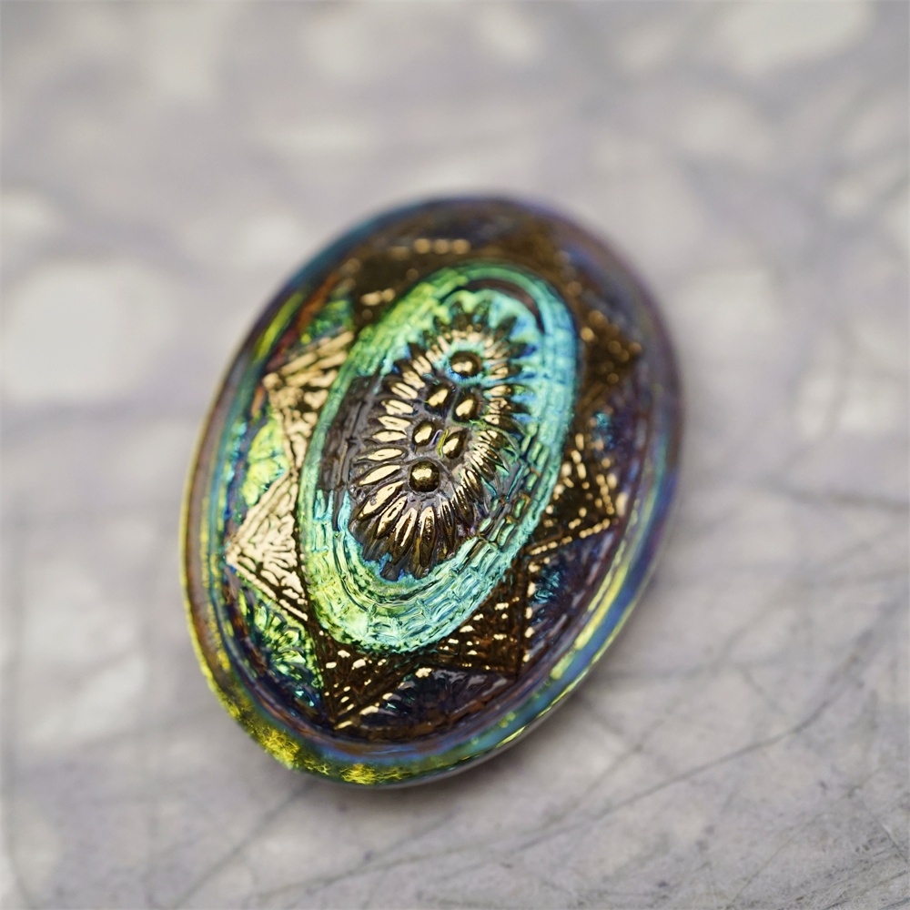 极光感孔雀蓝绿光泽复古花纹椭圆形~捷克古董纽扣珠侧孔珠玻璃琉璃珠 35X25MM