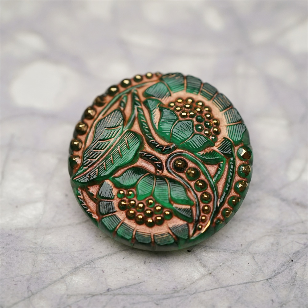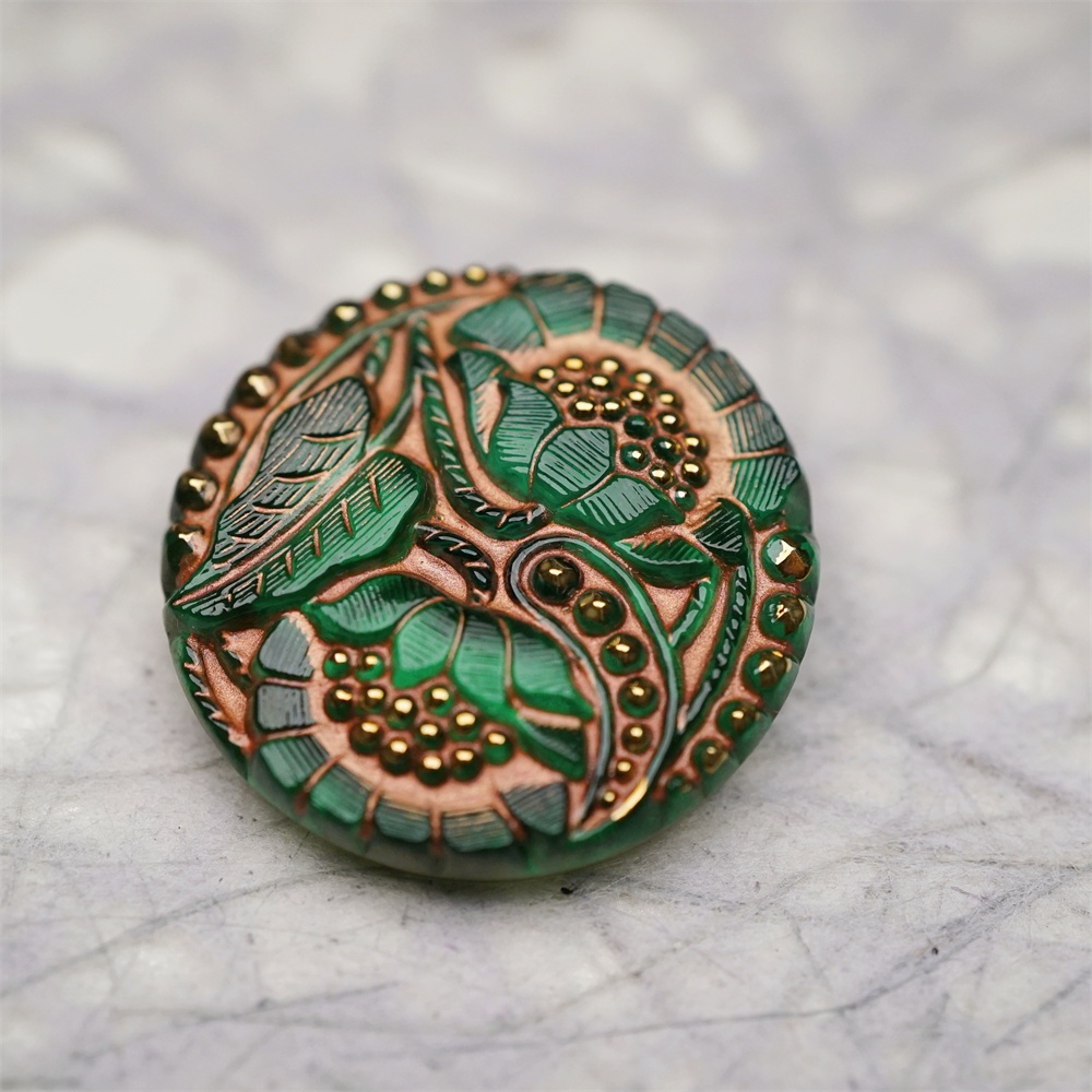 复古双子花朵绿色系~捷克古董纽扣珠侧孔珠玻璃琉璃珠 30MM