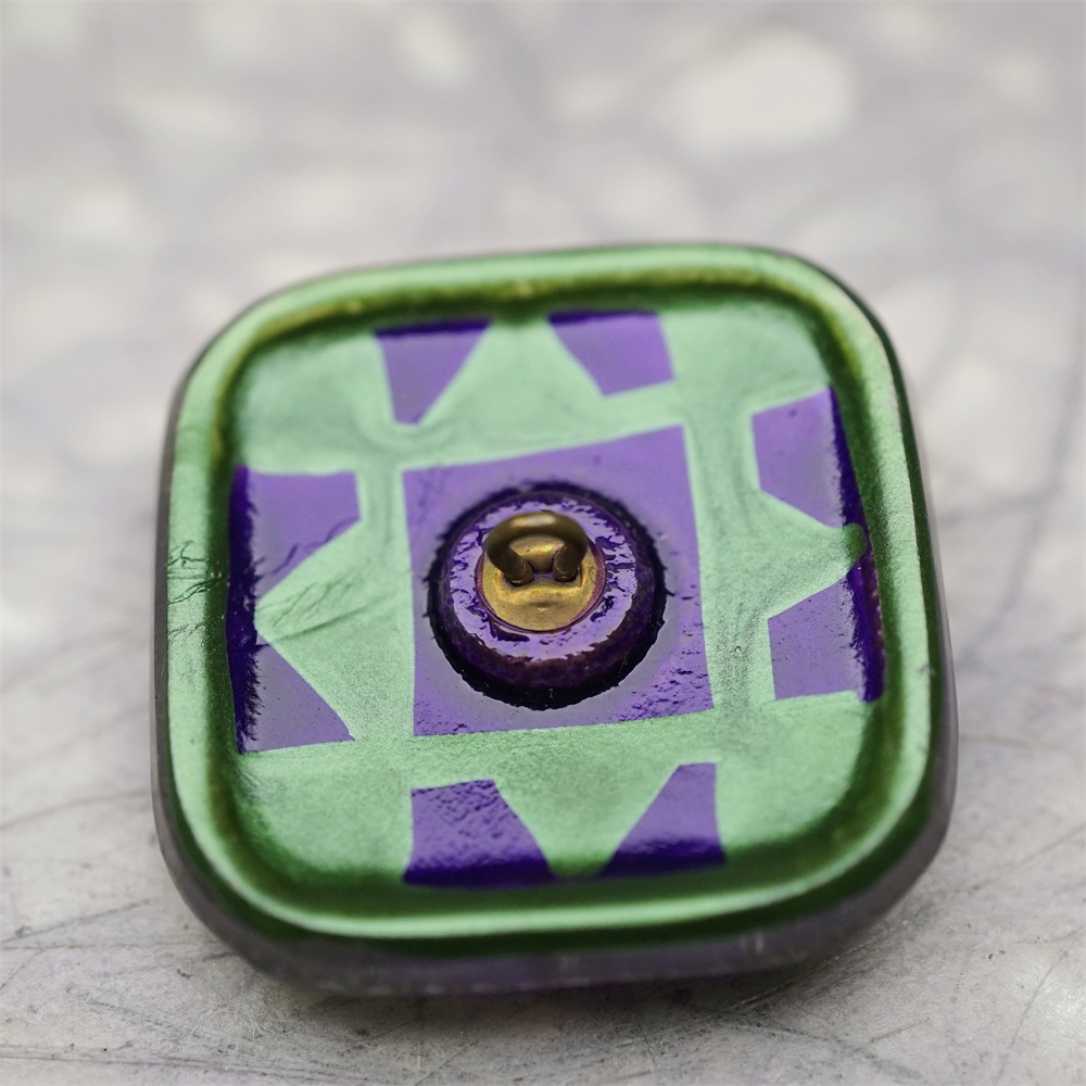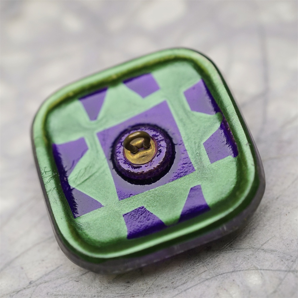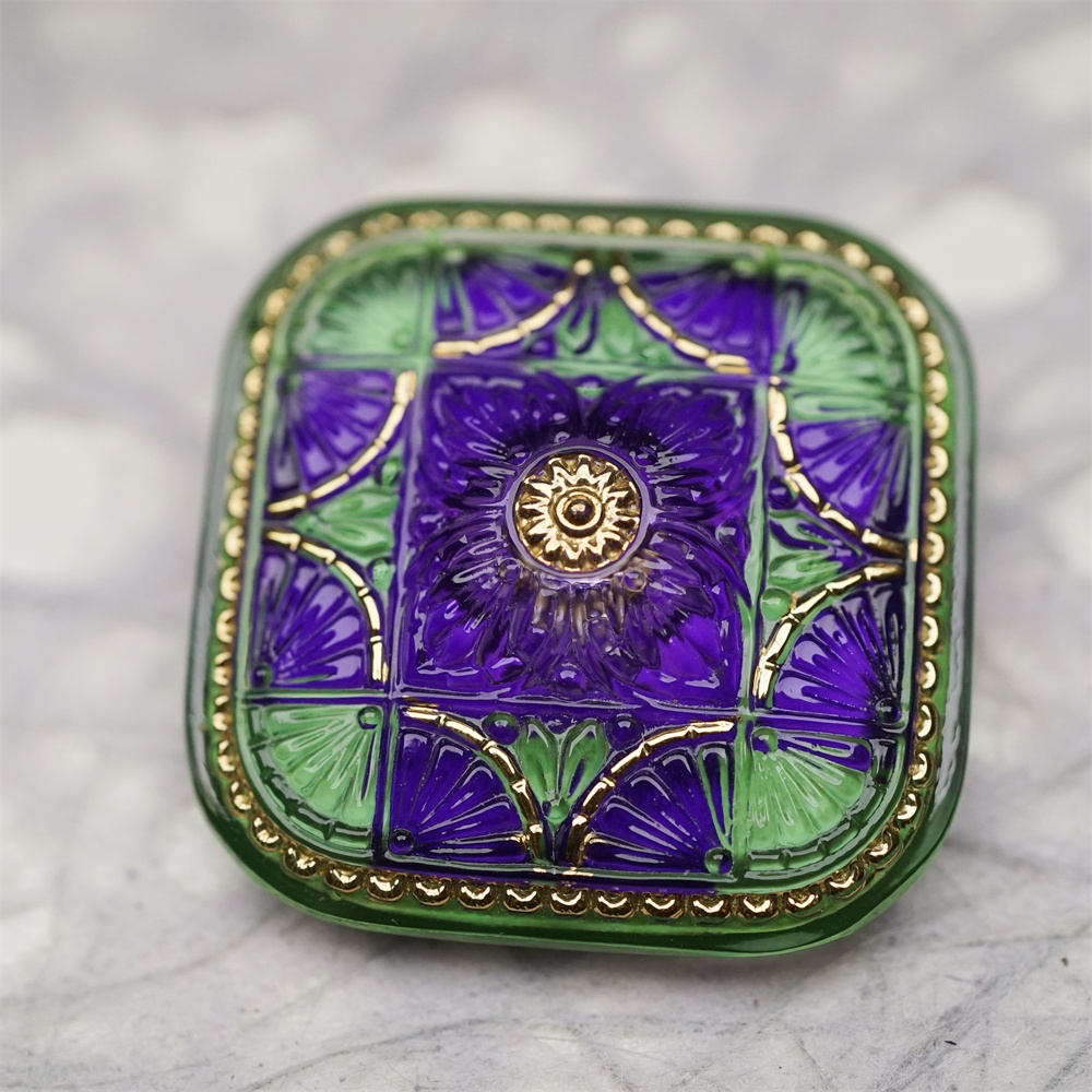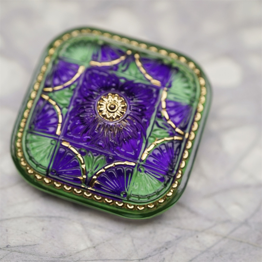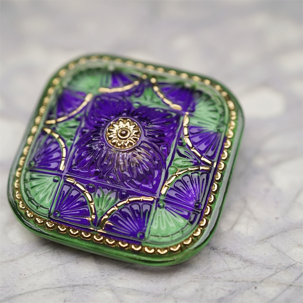 巴洛克撞色紫绿配色复古花纹方圆形~捷克古董纽扣珠侧孔珠玻璃琉璃珠 37MM