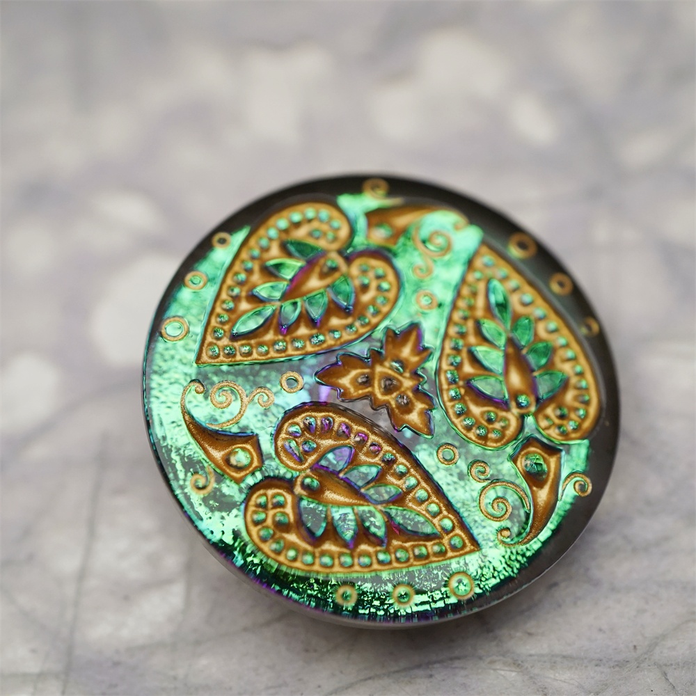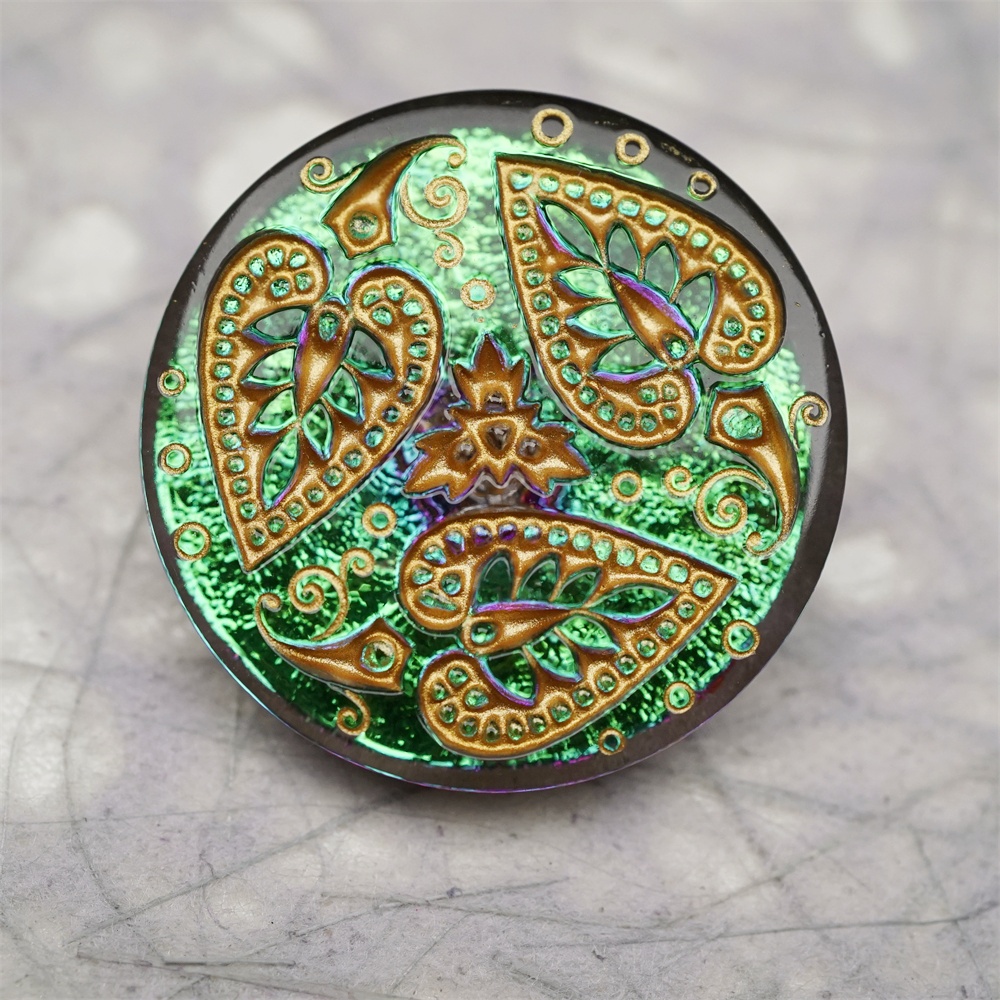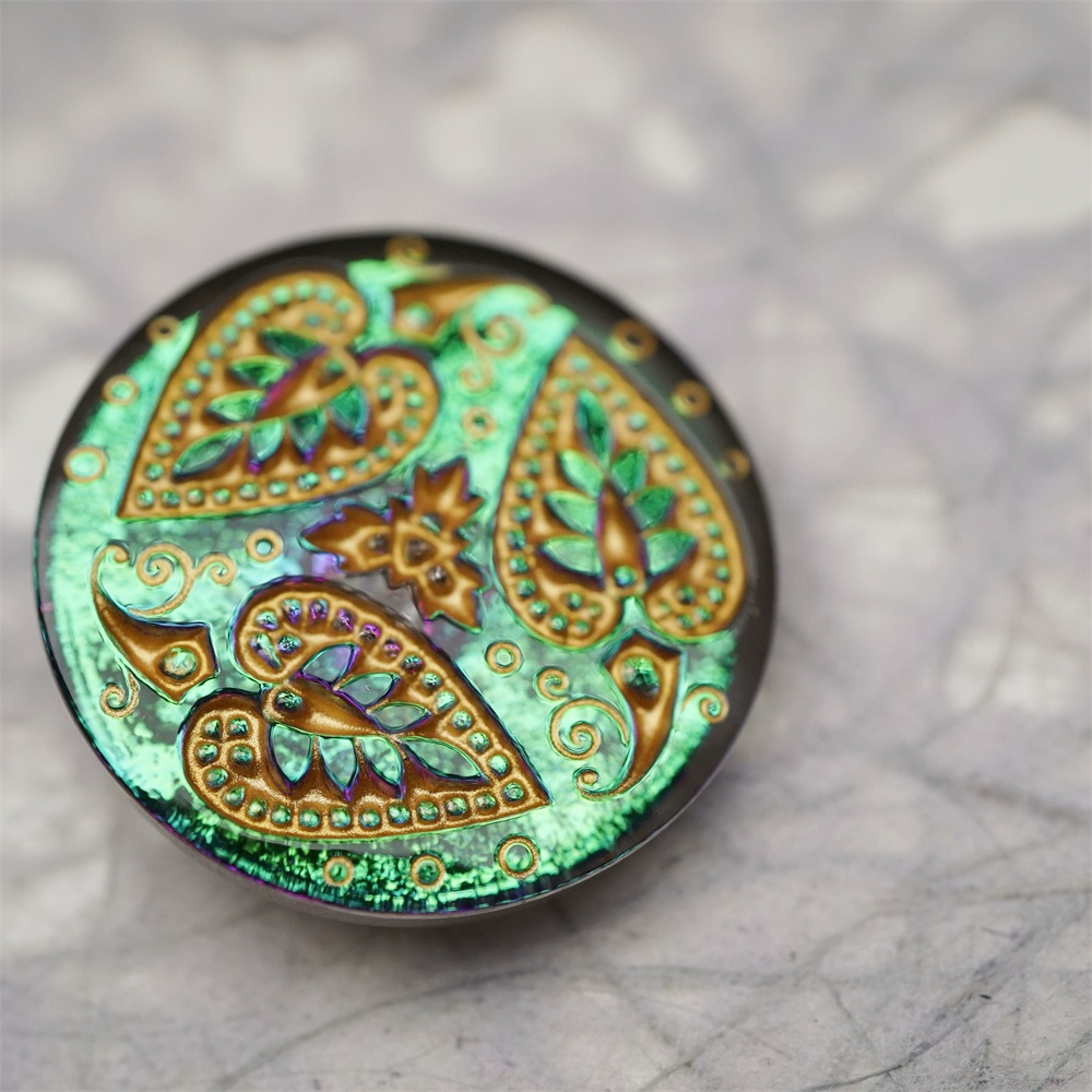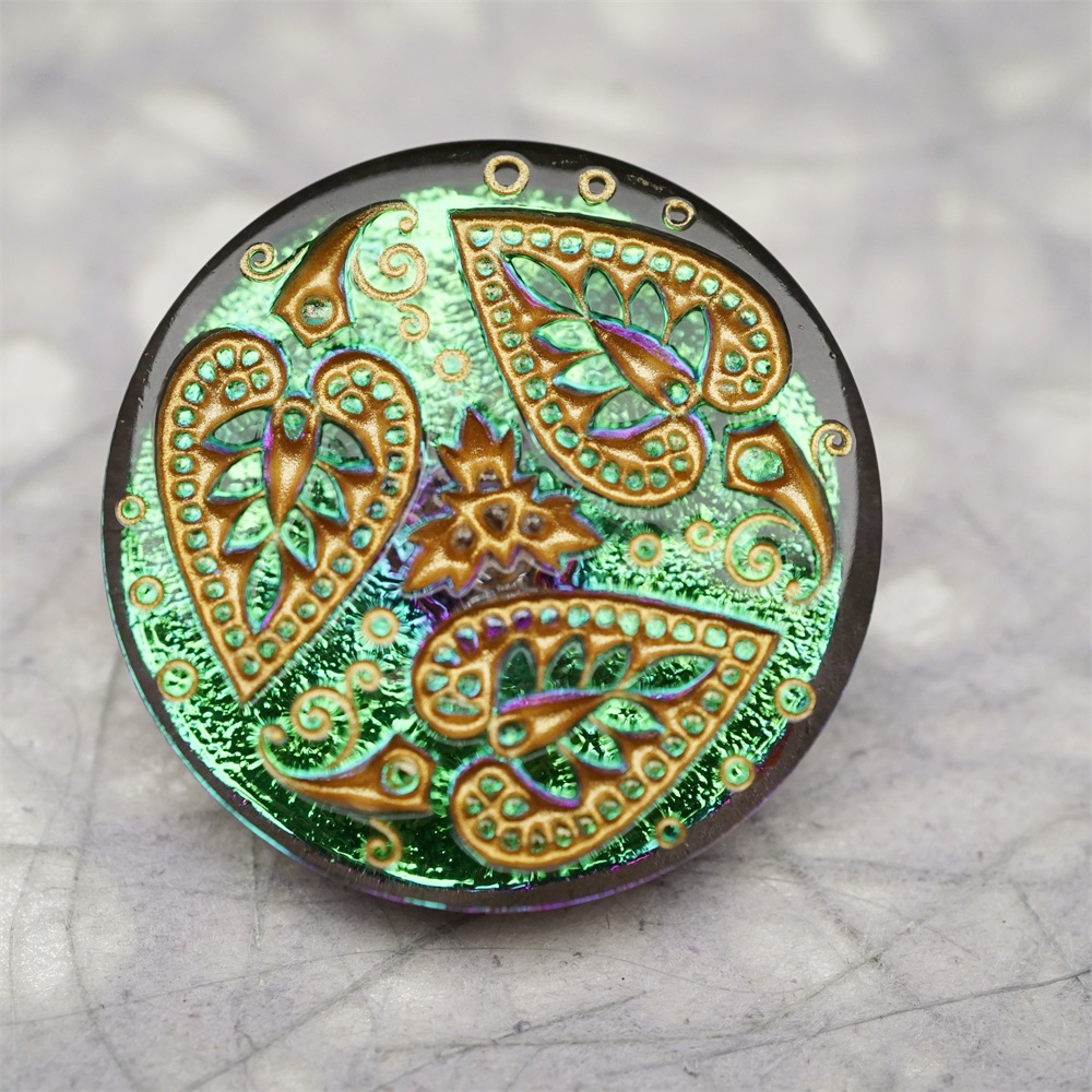 绿色光泽感爱心树叶花纹~捷克古董纽扣珠侧孔珠玻璃琉璃珠 33MM